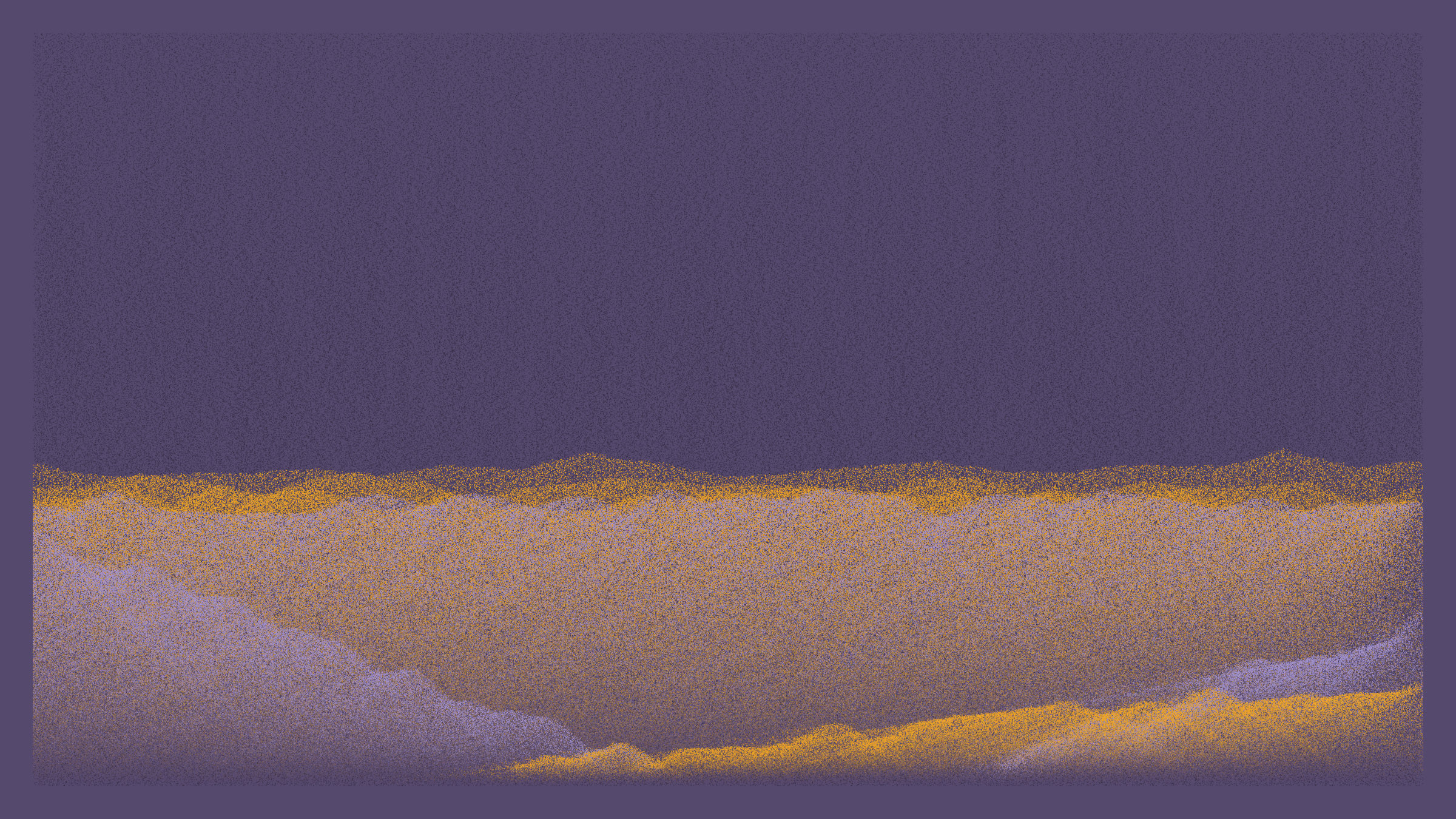 The Pointila algorithm first divides the canvas into columns. It then traverses the canvas dropping dots along those columns. From just a handful of layers, landscapes emerge. They take on a variety of forms: from rolling plains and steep canyons to jagged peaks and dreamy moors. Some are sharp and tense, others hazy and ethereal. They are coloured with handpicked palettes and animated with bold glitches – a nod to the shared optics of Pointillism and pixels.