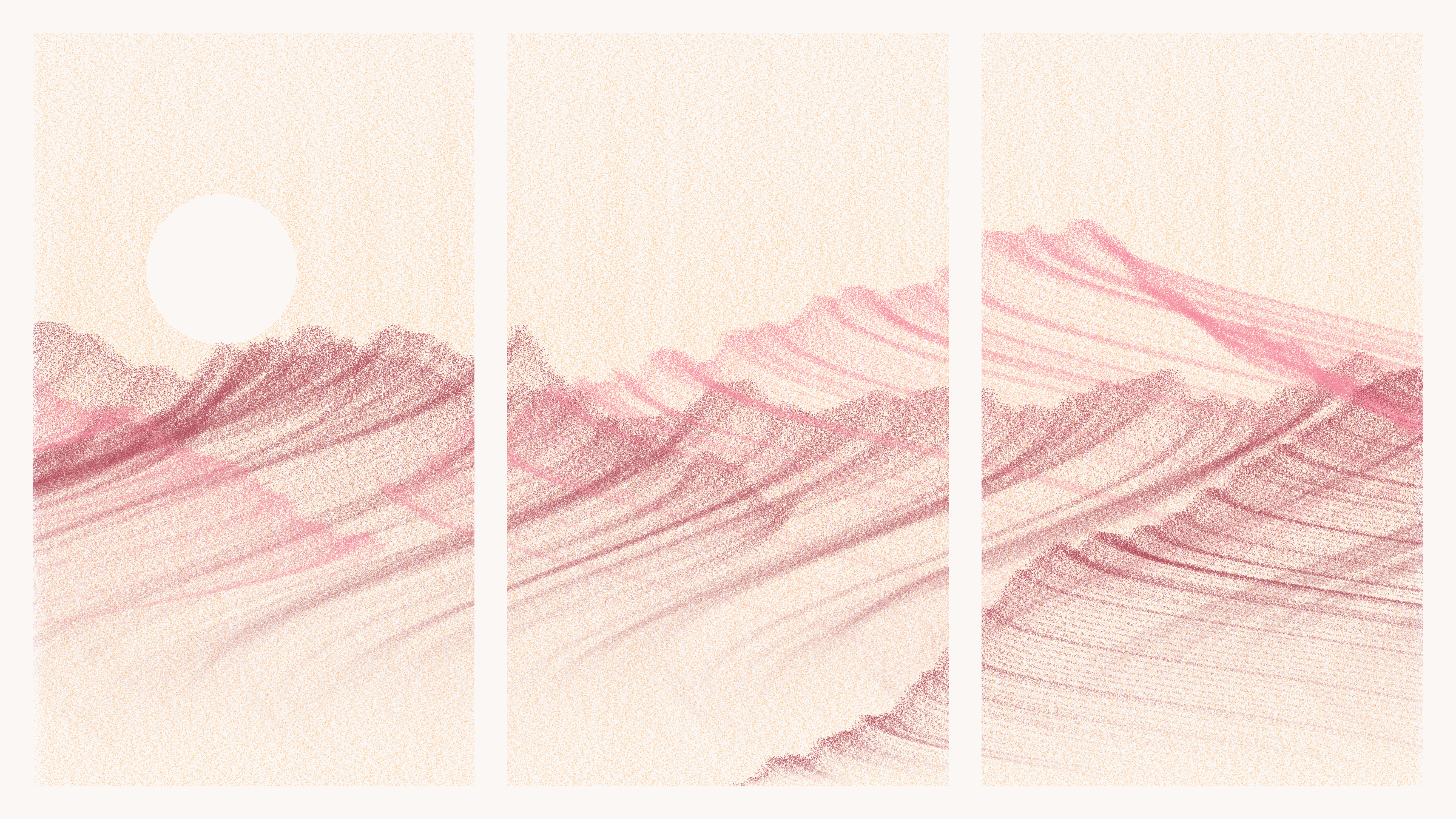 The Pointila algorithm first divides the canvas into columns. It then traverses the canvas dropping dots along those columns. From just a handful of layers, landscapes emerge. They take on a variety of forms: from rolling plains and steep canyons to jagged peaks and dreamy moors. Some are sharp and tense, others hazy and ethereal. They are coloured with handpicked palettes and animated with bold glitches – a nod to the shared optics of Pointillism and pixels.