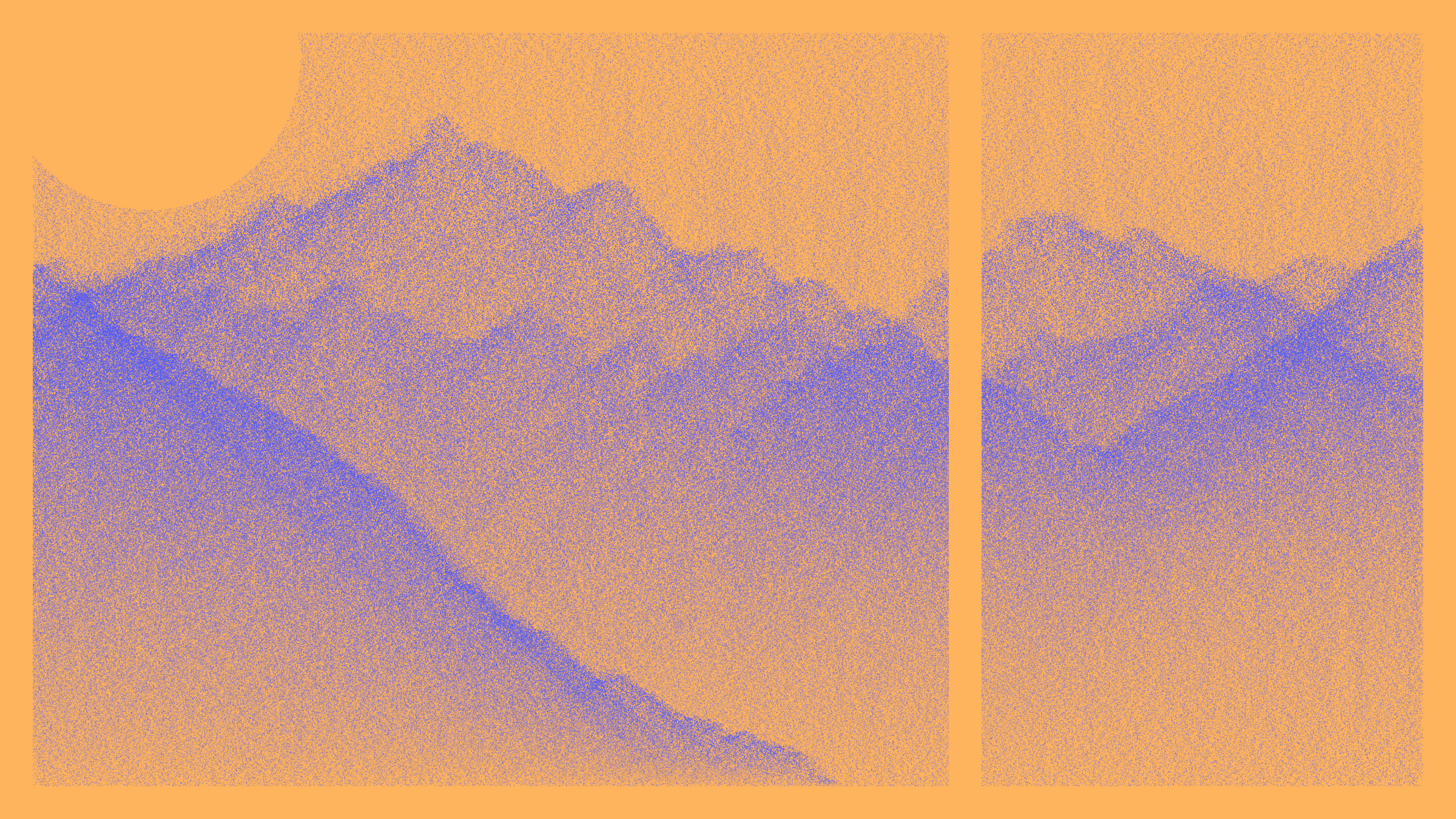 The Pointila algorithm first divides the canvas into columns. It then traverses the canvas dropping dots along those columns. From just a handful of layers, landscapes emerge. They take on a variety of forms: from rolling plains and steep canyons to jagged peaks and dreamy moors. Some are sharp and tense, others hazy and ethereal. They are coloured with handpicked palettes and animated with bold glitches – a nod to the shared optics of Pointillism and pixels.
