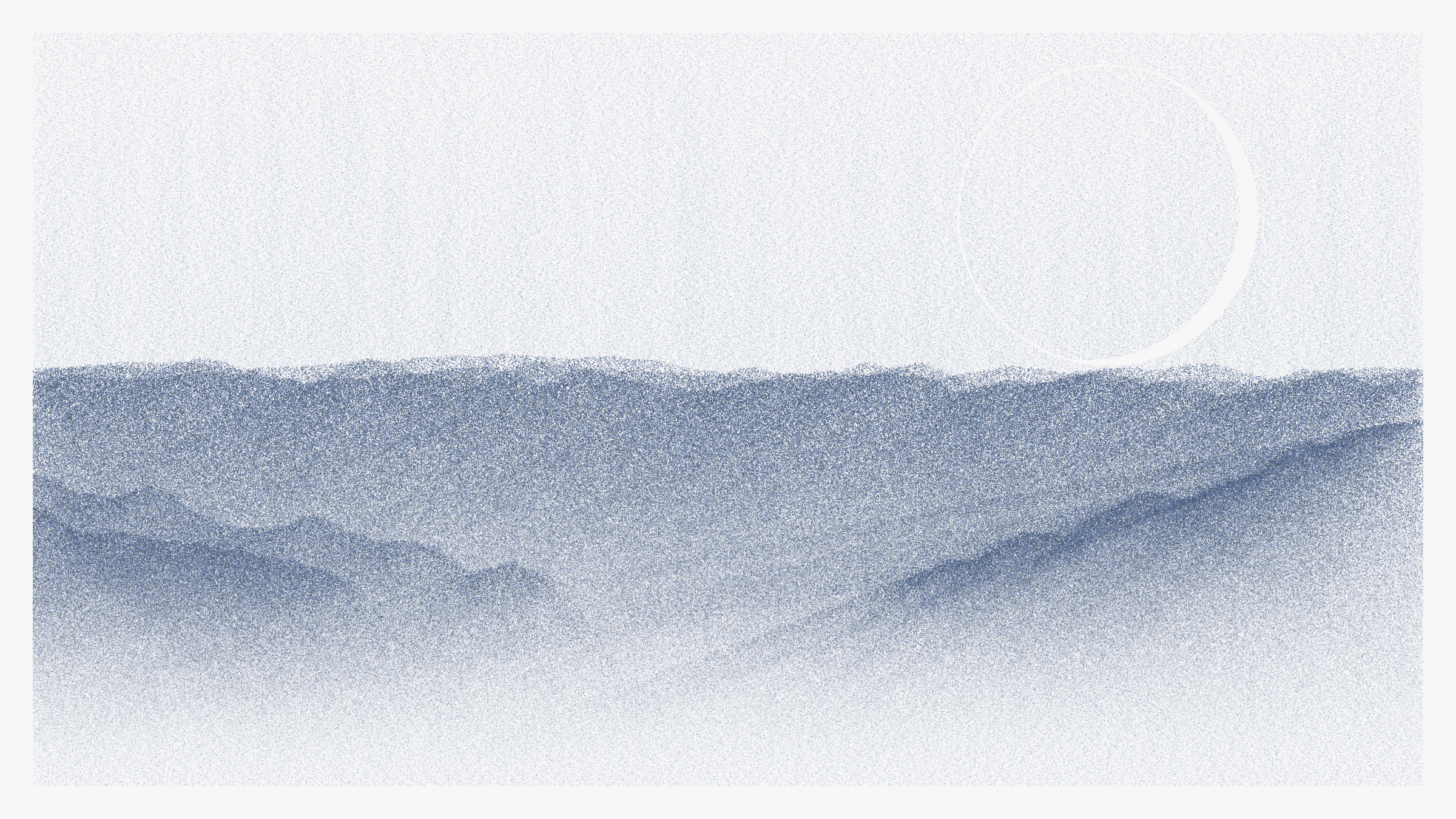 The Pointila algorithm first divides the canvas into columns. It then traverses the canvas dropping dots along those columns. From just a handful of layers, landscapes emerge. They take on a variety of forms: from rolling plains and steep canyons to jagged peaks and dreamy moors. Some are sharp and tense, others hazy and ethereal. They are coloured with handpicked palettes and animated with bold glitches – a nod to the shared optics of Pointillism and pixels.