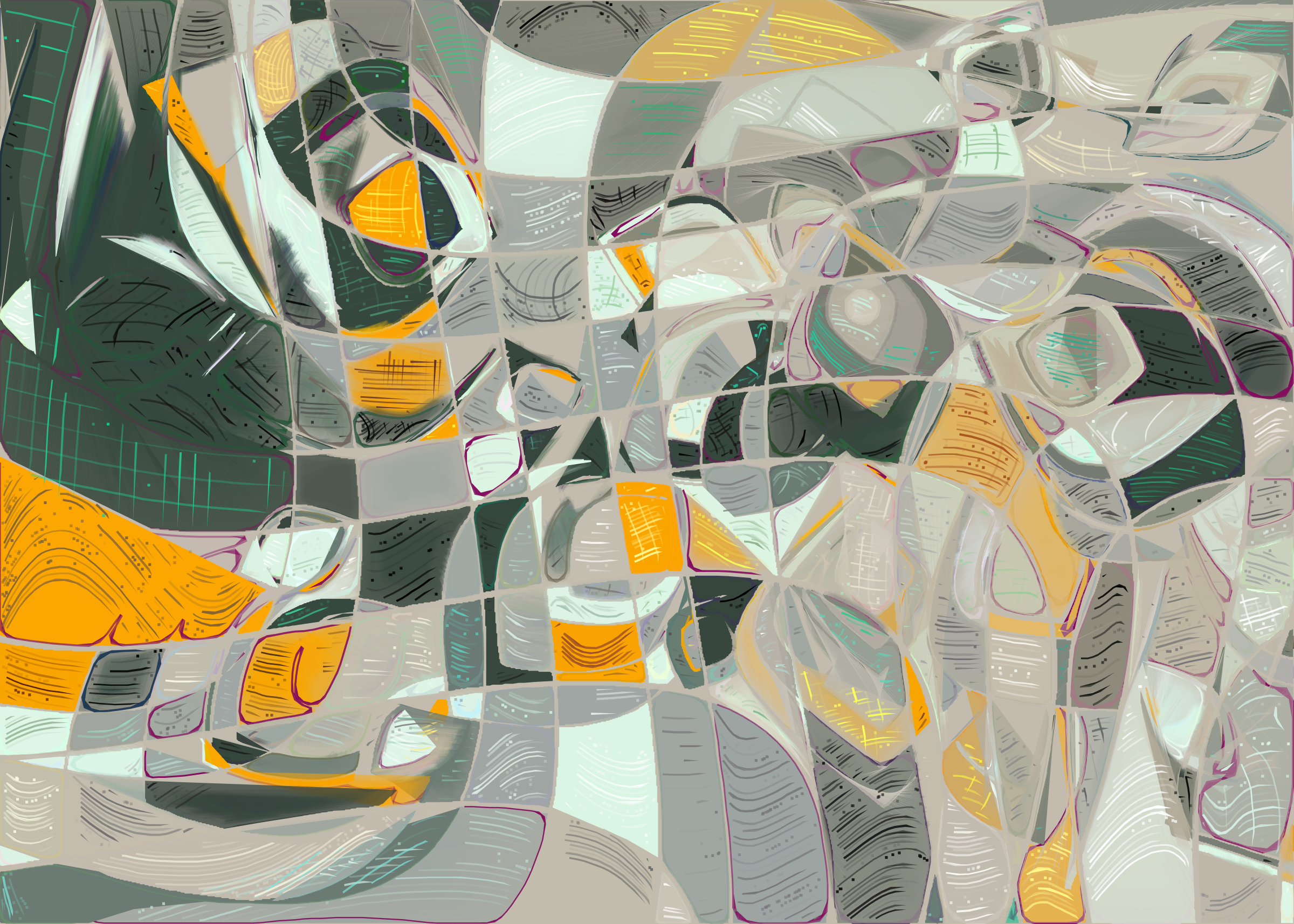 The rendering of **Running Moon** is inspired by stained glass and watercolor. It captures the sharpness of the glass and the softness of light using abstract forms. As organic shapes gradually expand to fill the space, brush-pen-like stripes solder these pieces together to form intricate compositions.