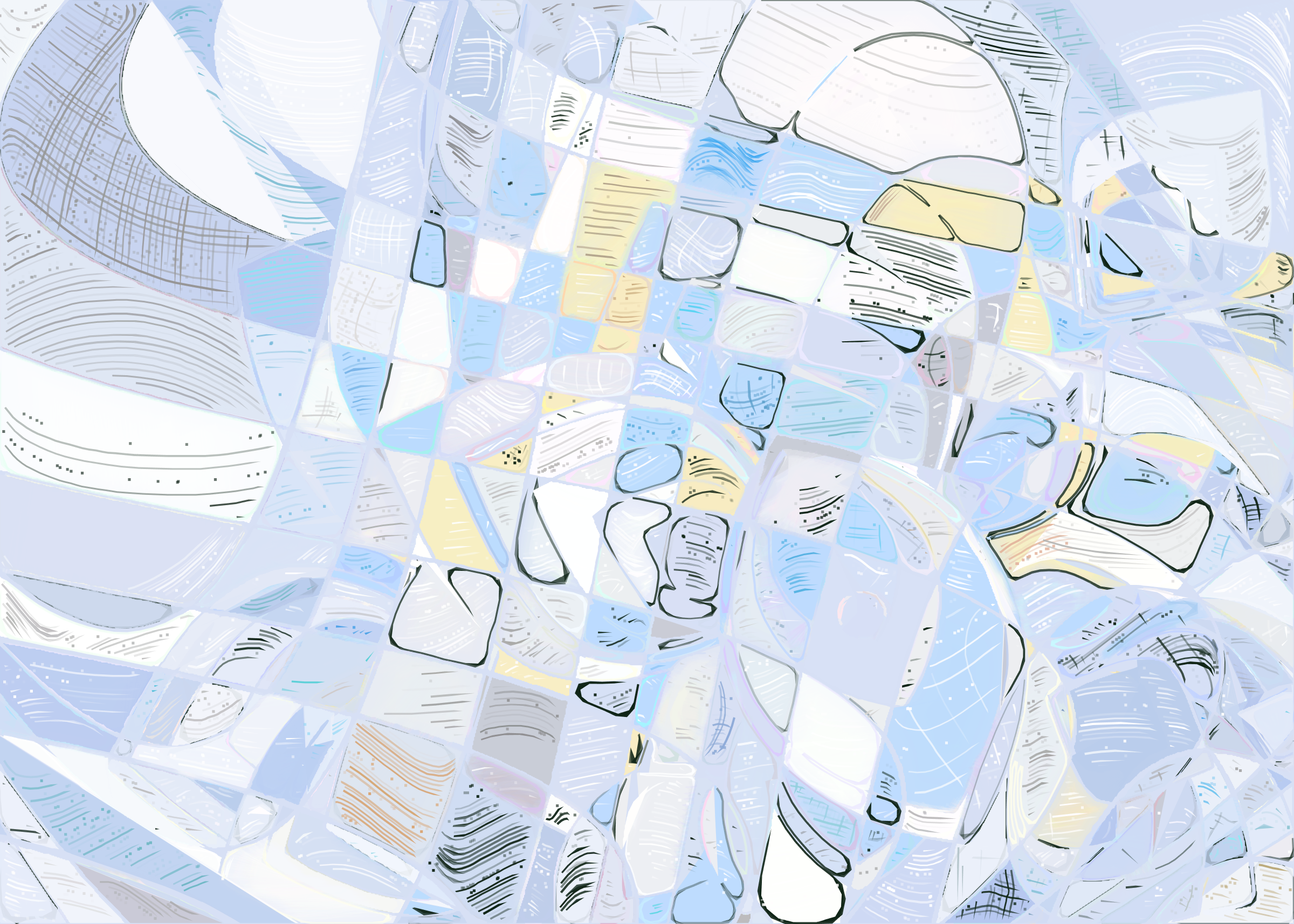 The rendering of **Running Moon** is inspired by stained glass and watercolor. It captures the sharpness of the glass and the softness of light using abstract forms. As organic shapes gradually expand to fill the space, brush-pen-like stripes solder these pieces together to form intricate compositions.