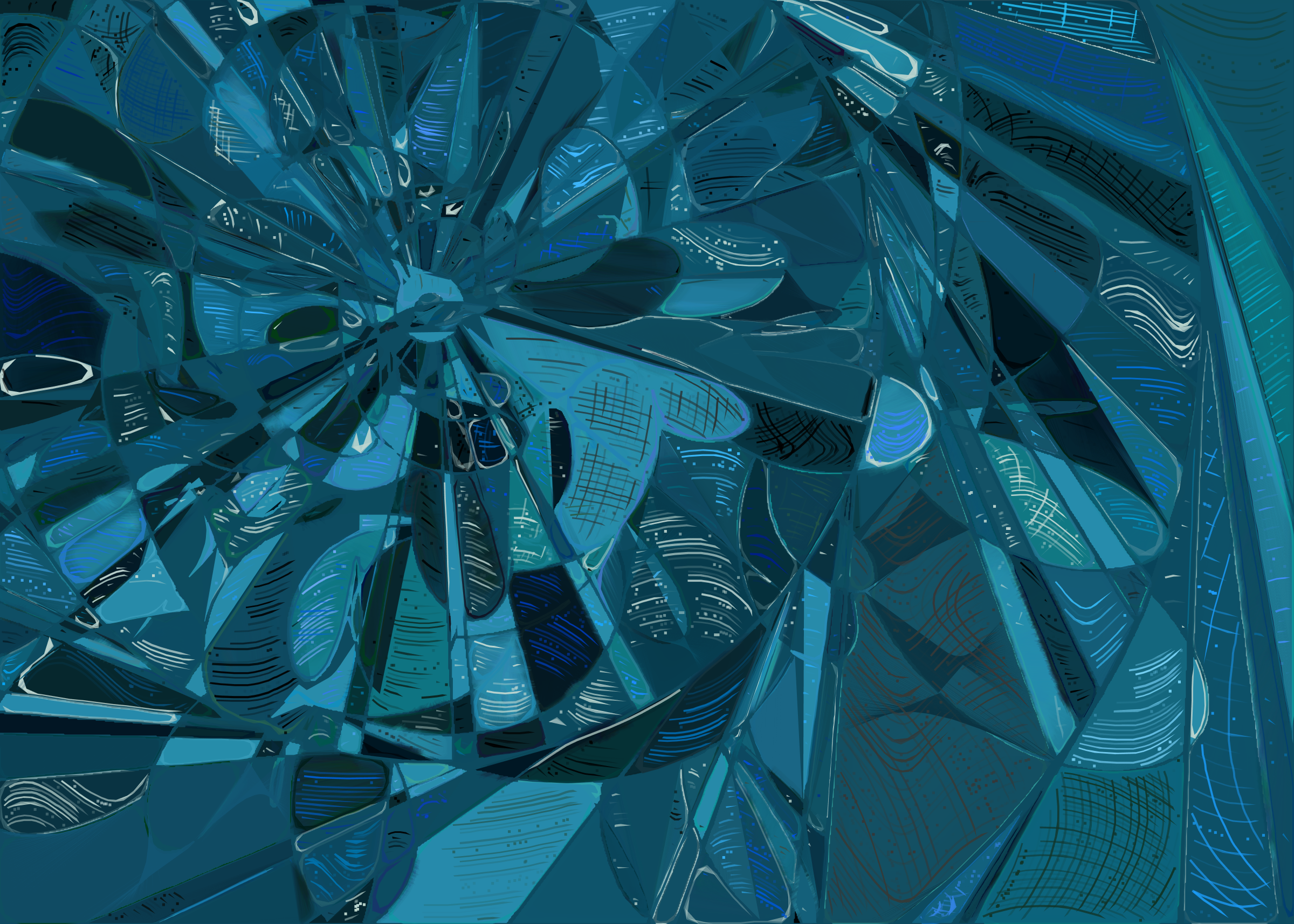 The rendering of **Running Moon** is inspired by stained glass and watercolor. It captures the sharpness of the glass and the softness of light using abstract forms. As organic shapes gradually expand to fill the space, brush-pen-like stripes solder these pieces together to form intricate compositions.