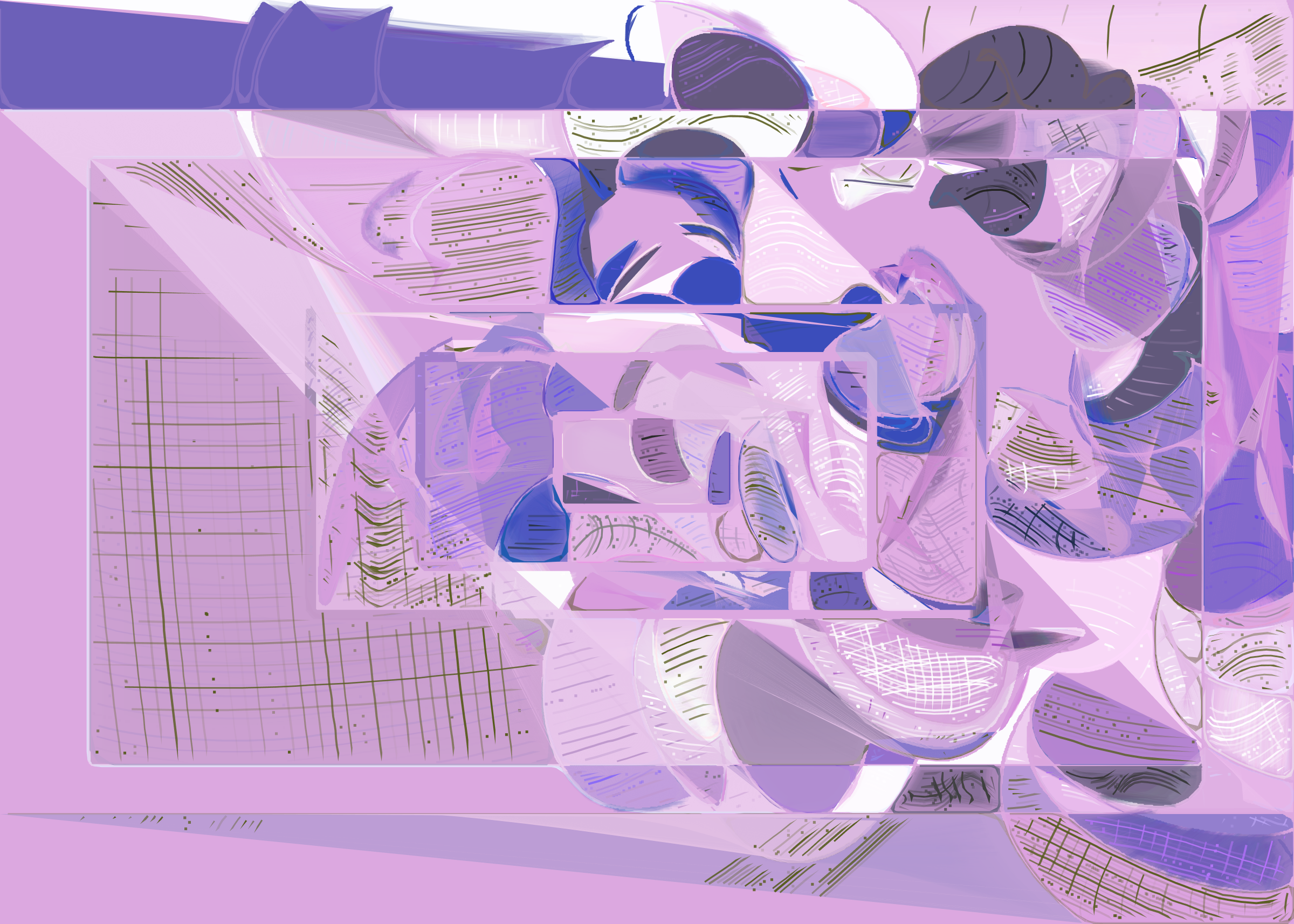 The rendering of **Running Moon** is inspired by stained glass and watercolor. It captures the sharpness of the glass and the softness of light using abstract forms. As organic shapes gradually expand to fill the space, brush-pen-like stripes solder these pieces together to form intricate compositions.