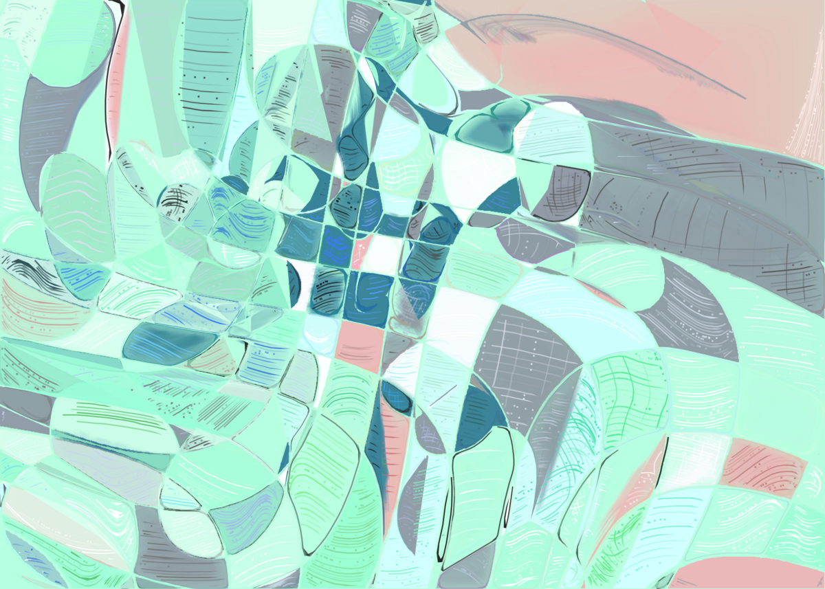 The rendering of **Running Moon** is inspired by stained glass and watercolor. It captures the sharpness of the glass and the softness of light using abstract forms. As organic shapes gradually expand to fill the space, brush-pen-like stripes solder these pieces together to form intricate compositions.