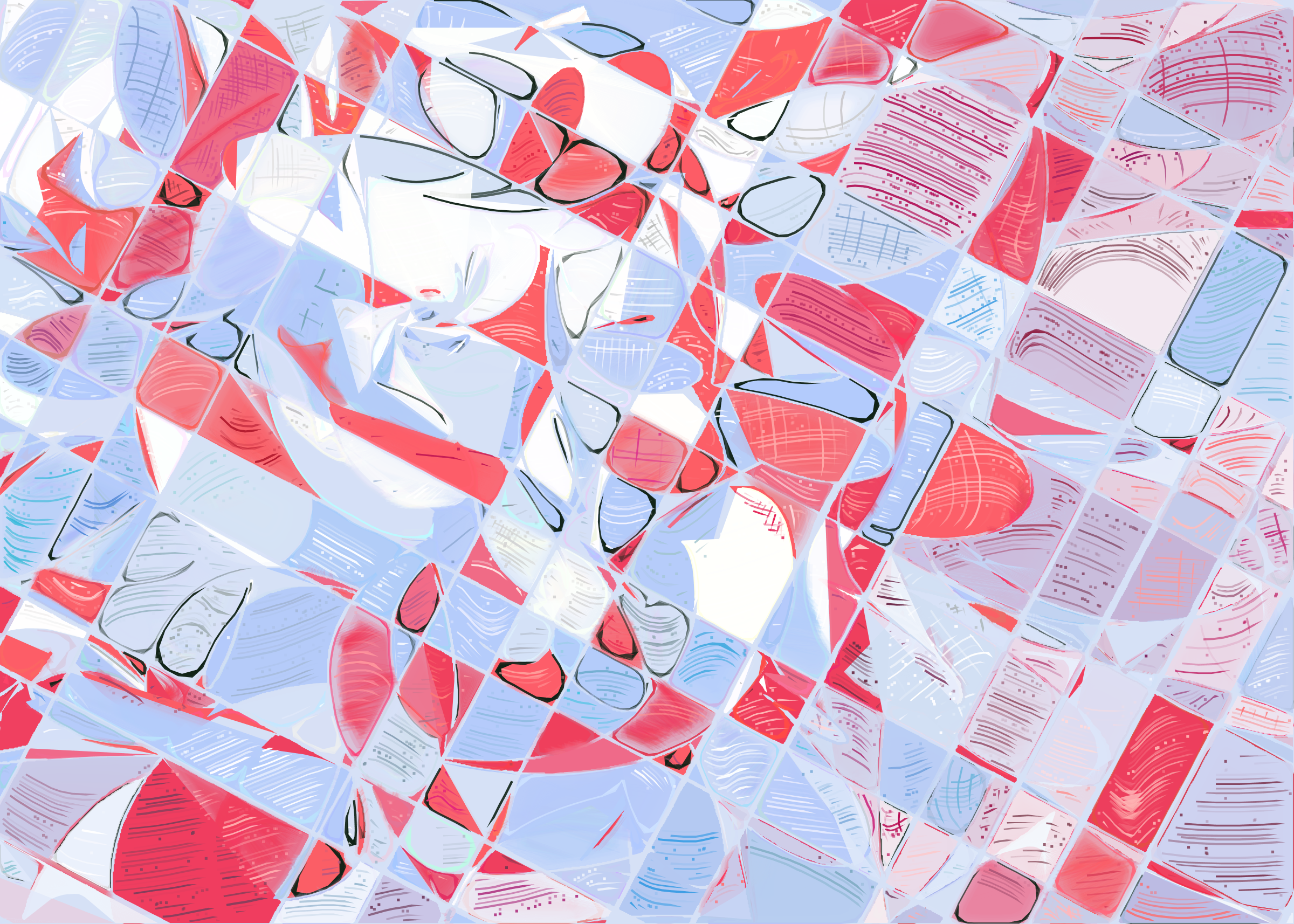 The rendering of **Running Moon** is inspired by stained glass and watercolor. It captures the sharpness of the glass and the softness of light using abstract forms. As organic shapes gradually expand to fill the space, brush-pen-like stripes solder these pieces together to form intricate compositions.