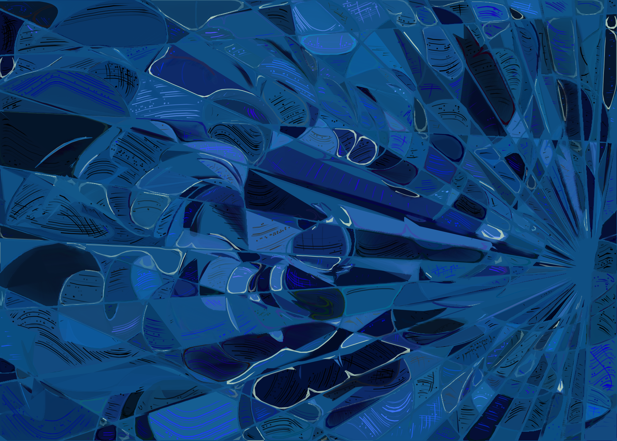 The rendering of **Running Moon** is inspired by stained glass and watercolor. It captures the sharpness of the glass and the softness of light using abstract forms. As organic shapes gradually expand to fill the space, brush-pen-like stripes solder these pieces together to form intricate compositions.