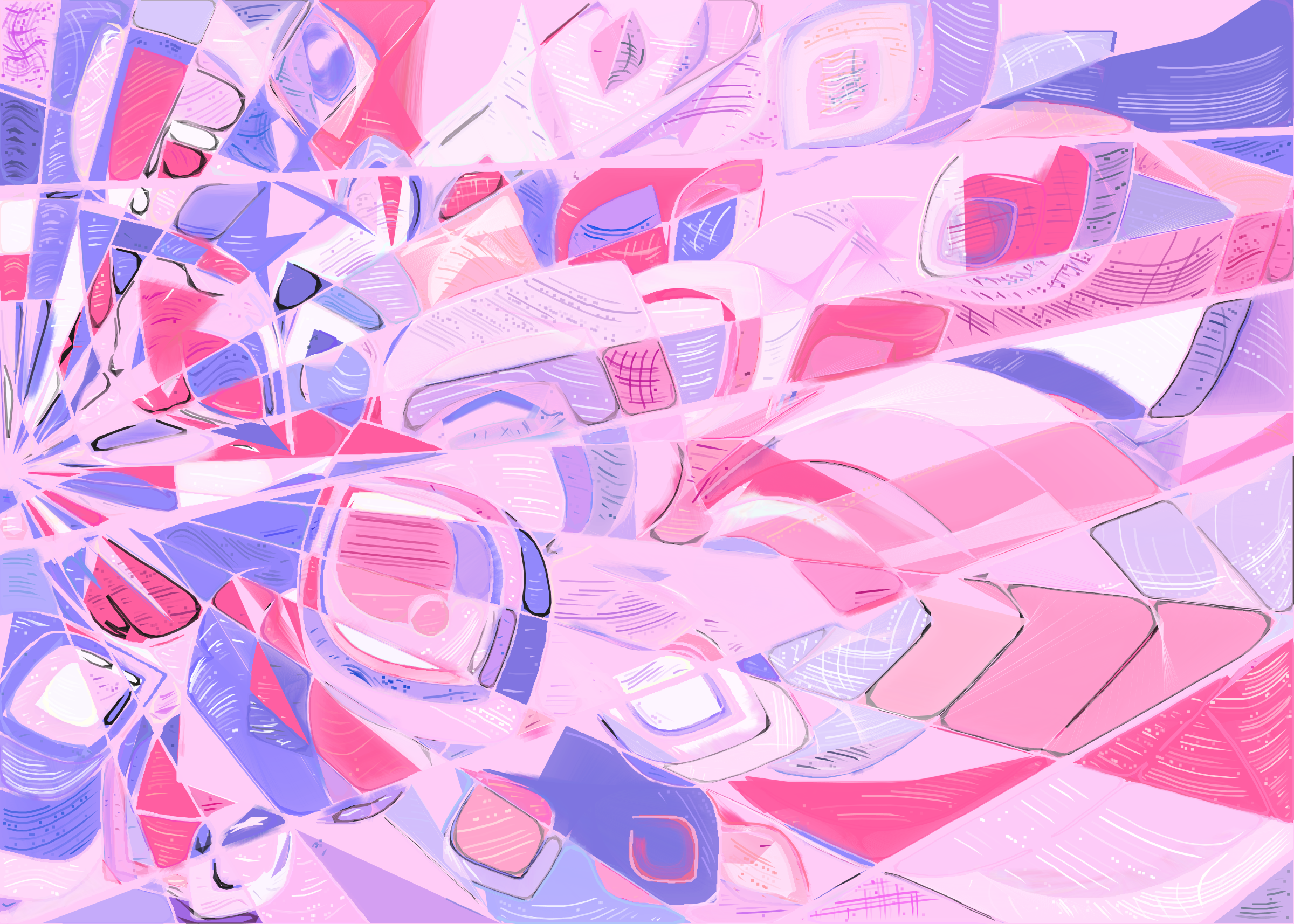 The rendering of **Running Moon** is inspired by stained glass and watercolor. It captures the sharpness of the glass and the softness of light using abstract forms. As organic shapes gradually expand to fill the space, brush-pen-like stripes solder these pieces together to form intricate compositions.