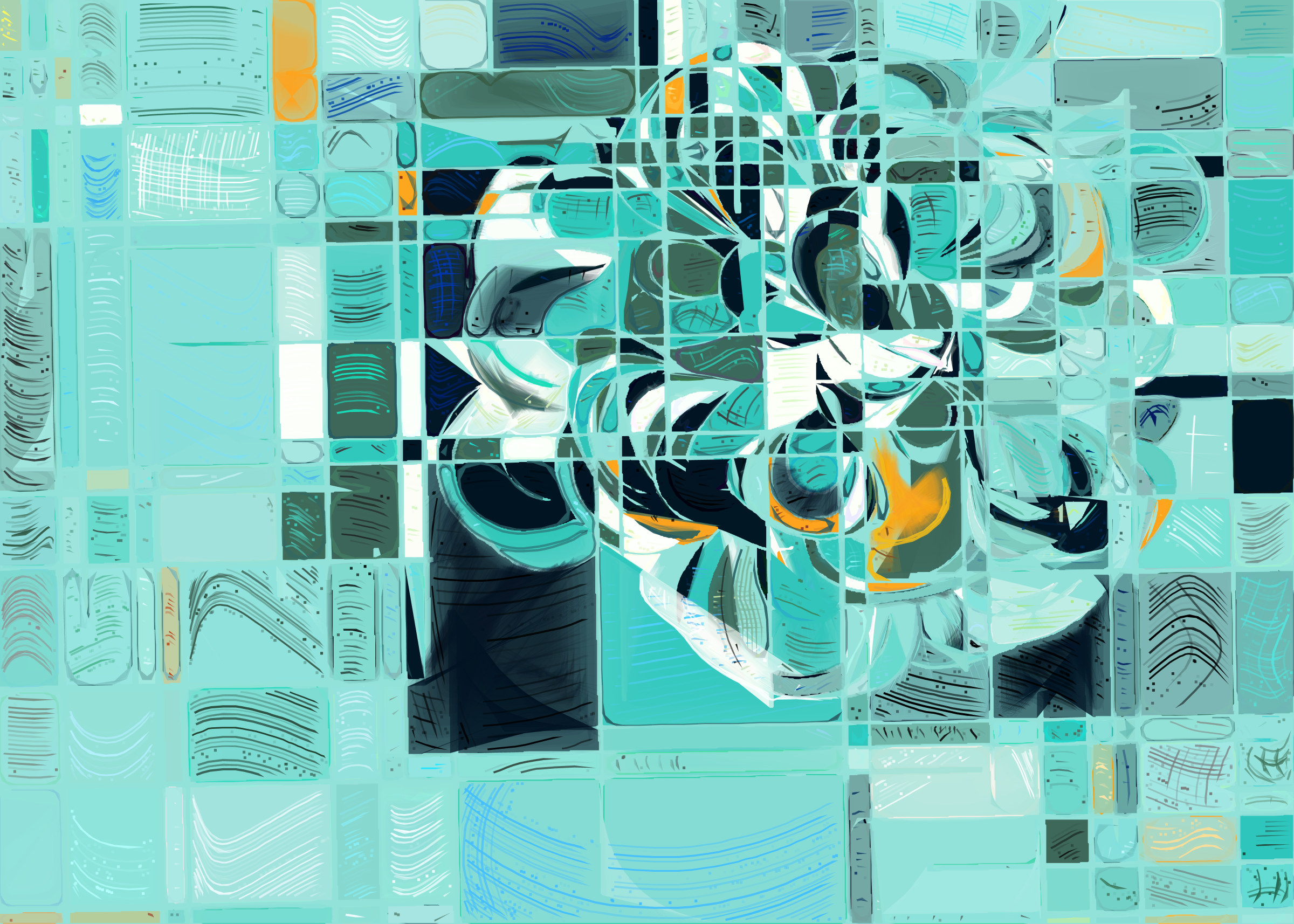 The rendering of **Running Moon** is inspired by stained glass and watercolor. It captures the sharpness of the glass and the softness of light using abstract forms. As organic shapes gradually expand to fill the space, brush-pen-like stripes solder these pieces together to form intricate compositions.