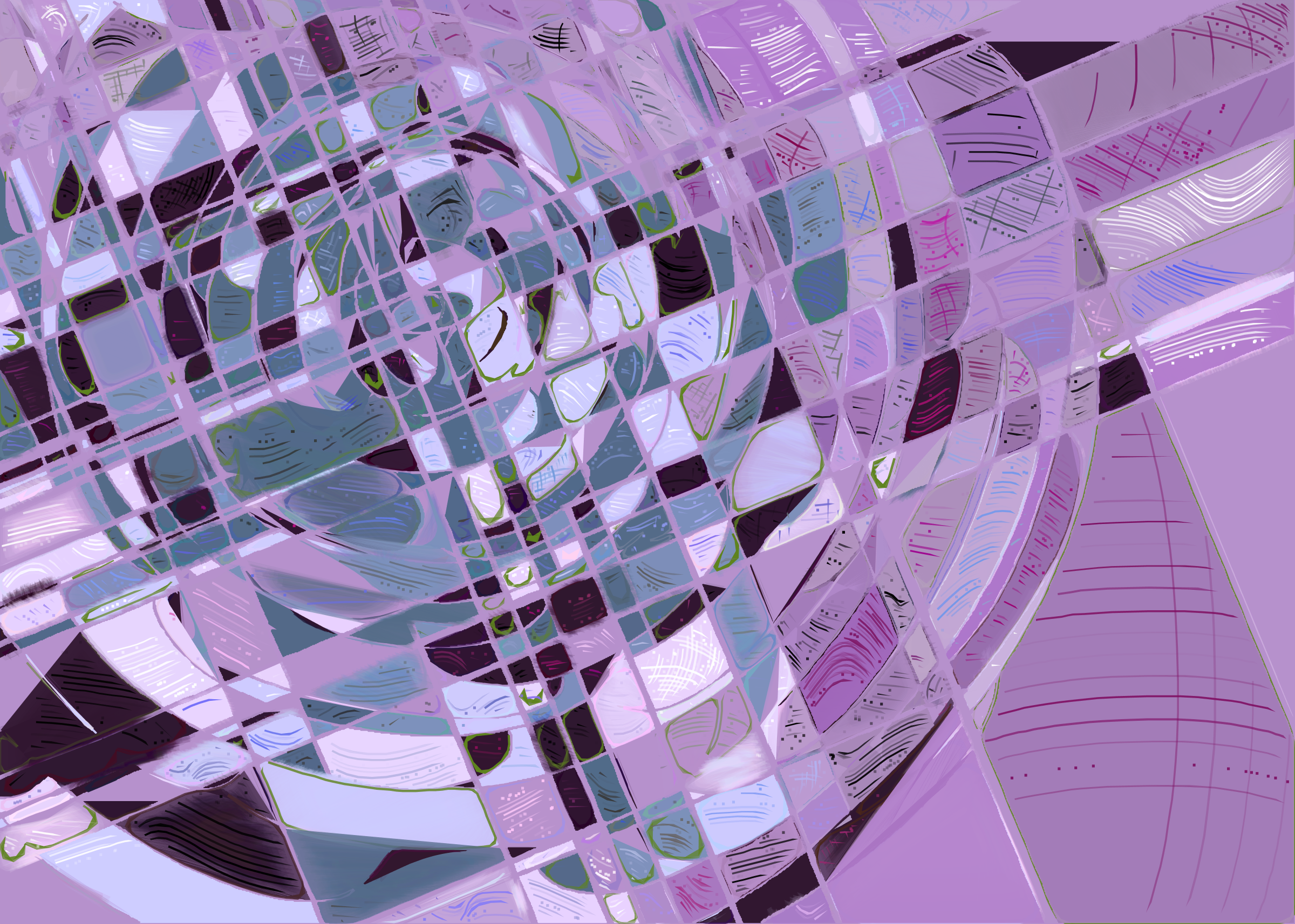 The rendering of **Running Moon** is inspired by stained glass and watercolor. It captures the sharpness of the glass and the softness of light using abstract forms. As organic shapes gradually expand to fill the space, brush-pen-like stripes solder these pieces together to form intricate compositions.