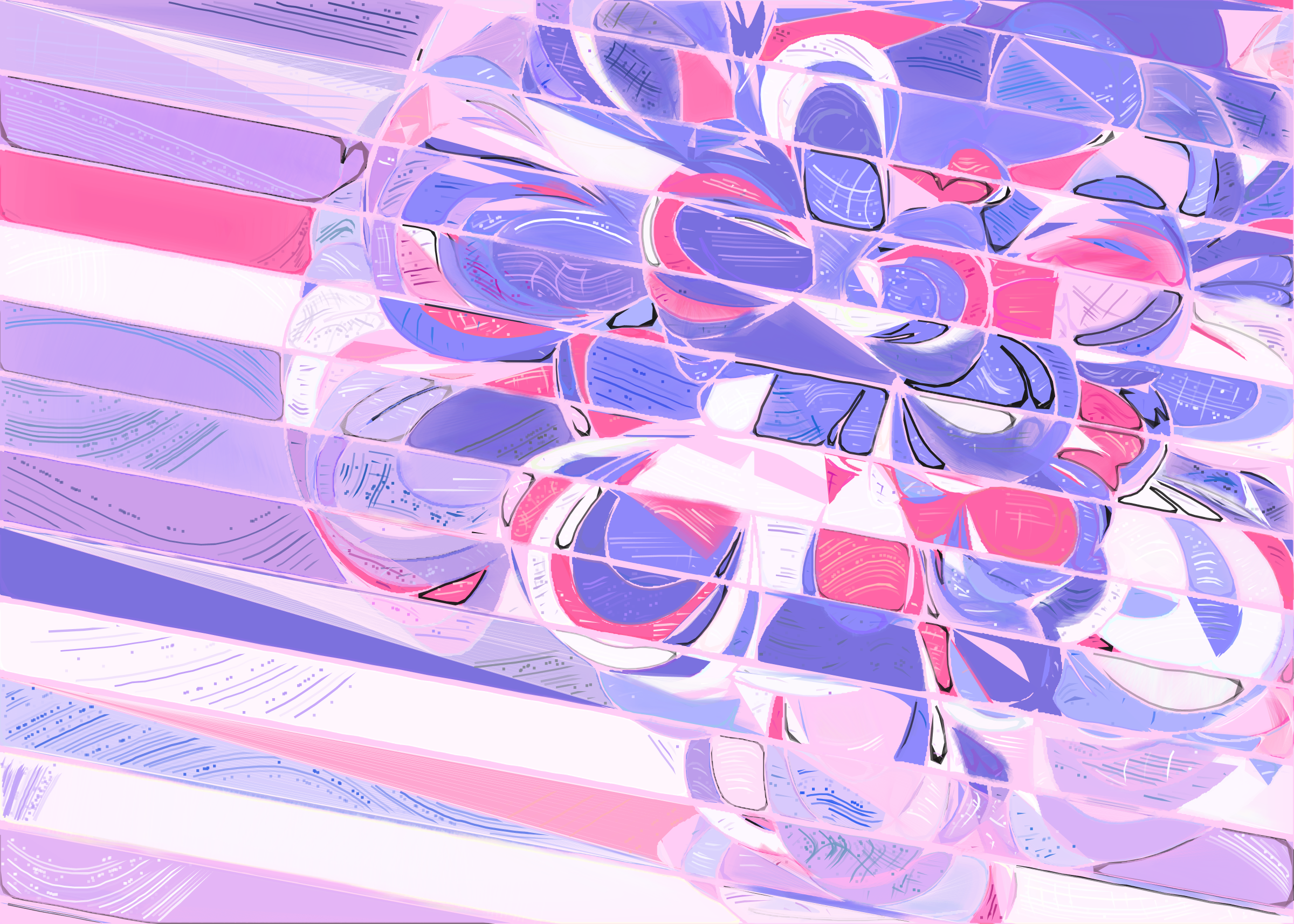 The rendering of **Running Moon** is inspired by stained glass and watercolor. It captures the sharpness of the glass and the softness of light using abstract forms. As organic shapes gradually expand to fill the space, brush-pen-like stripes solder these pieces together to form intricate compositions.