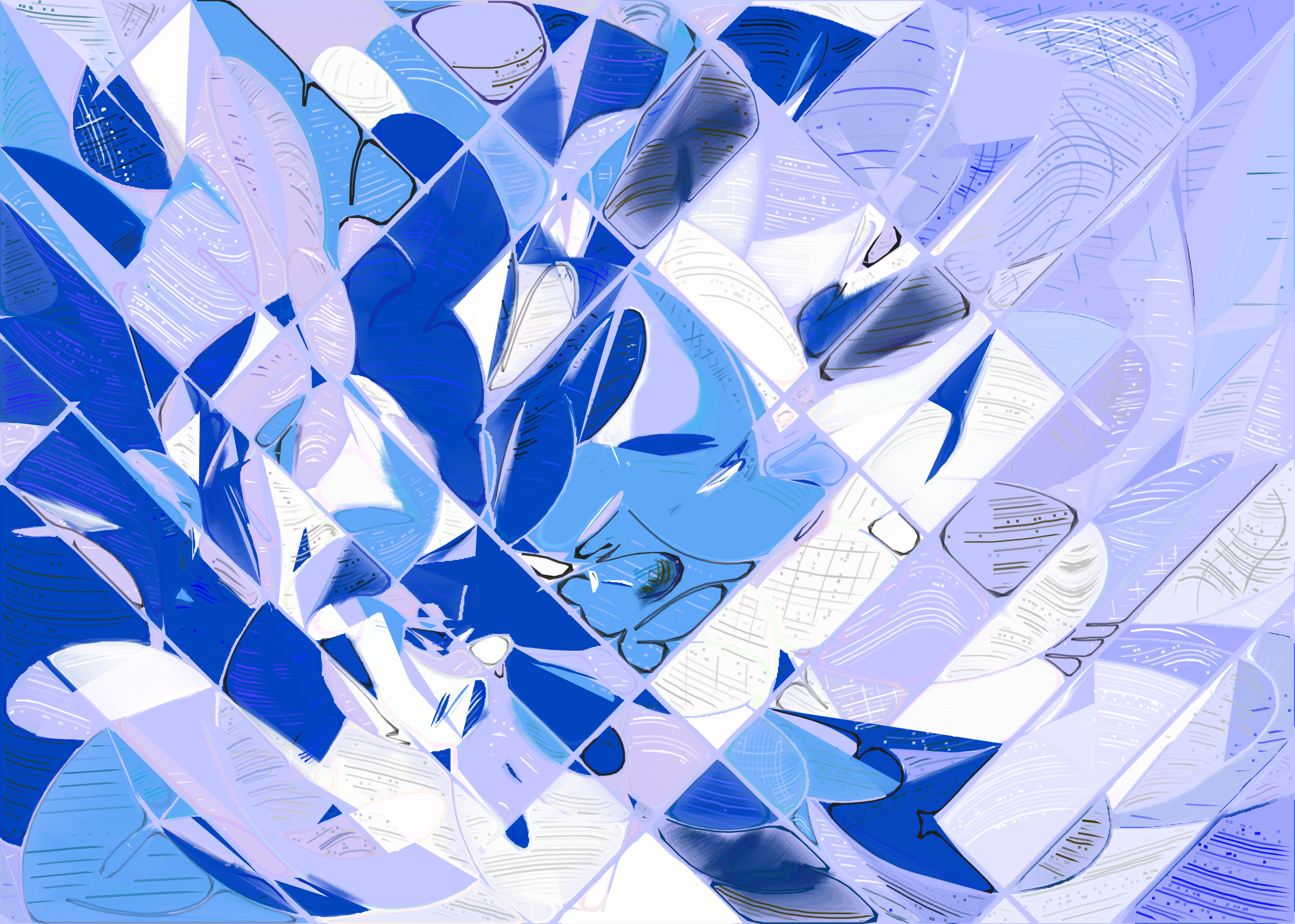 The rendering of **Running Moon** is inspired by stained glass and watercolor. It captures the sharpness of the glass and the softness of light using abstract forms. As organic shapes gradually expand to fill the space, brush-pen-like stripes solder these pieces together to form intricate compositions.