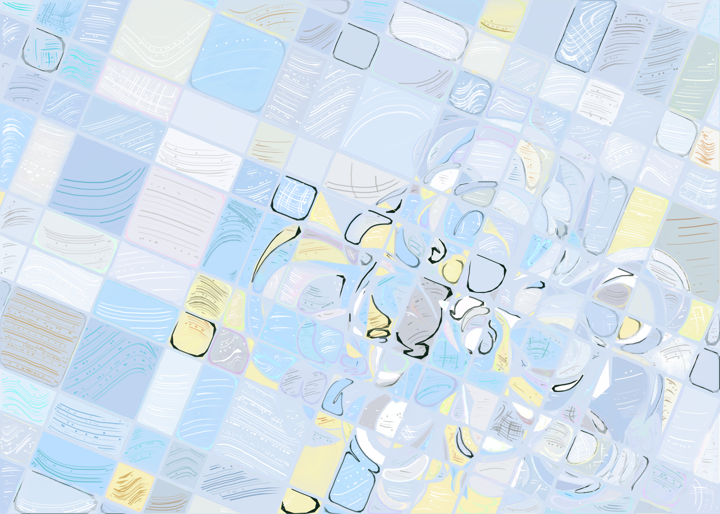 The rendering of **Running Moon** is inspired by stained glass and watercolor. It captures the sharpness of the glass and the softness of light using abstract forms. As organic shapes gradually expand to fill the space, brush-pen-like stripes solder these pieces together to form intricate compositions.