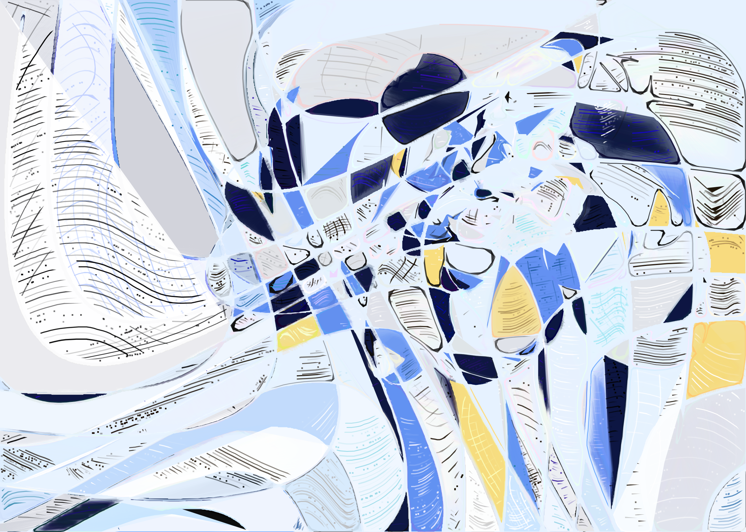 The rendering of **Running Moon** is inspired by stained glass and watercolor. It captures the sharpness of the glass and the softness of light using abstract forms. As organic shapes gradually expand to fill the space, brush-pen-like stripes solder these pieces together to form intricate compositions.