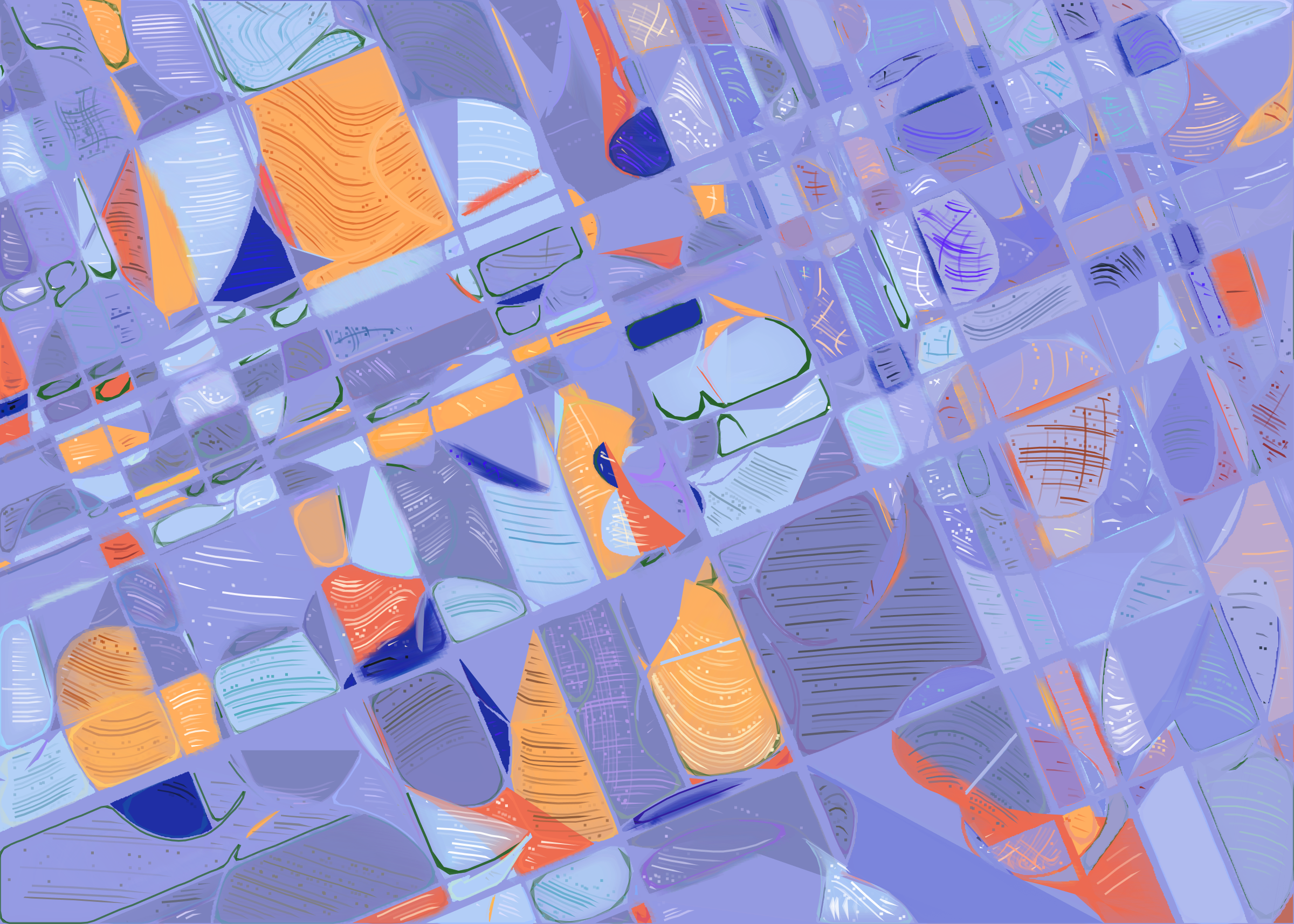 The rendering of **Running Moon** is inspired by stained glass and watercolor. It captures the sharpness of the glass and the softness of light using abstract forms. As organic shapes gradually expand to fill the space, brush-pen-like stripes solder these pieces together to form intricate compositions.