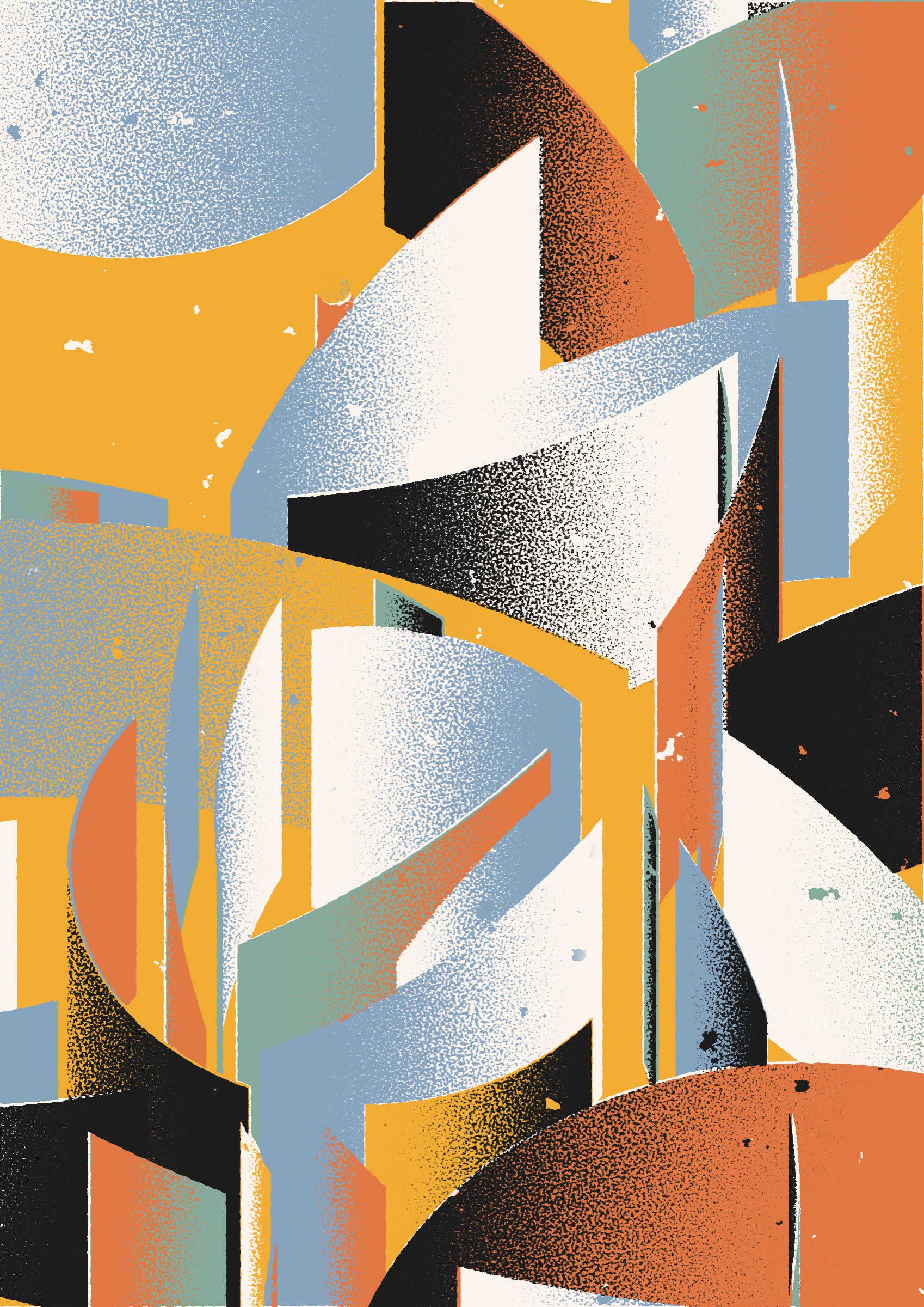 The generative system underlying the rendering mimics the screen printing process by rendering and applying a single color at a time to a master image. Each virtual screen may be more or less aligned with the master, creating a lovely flawed balance to the precision of the rendered geometry.