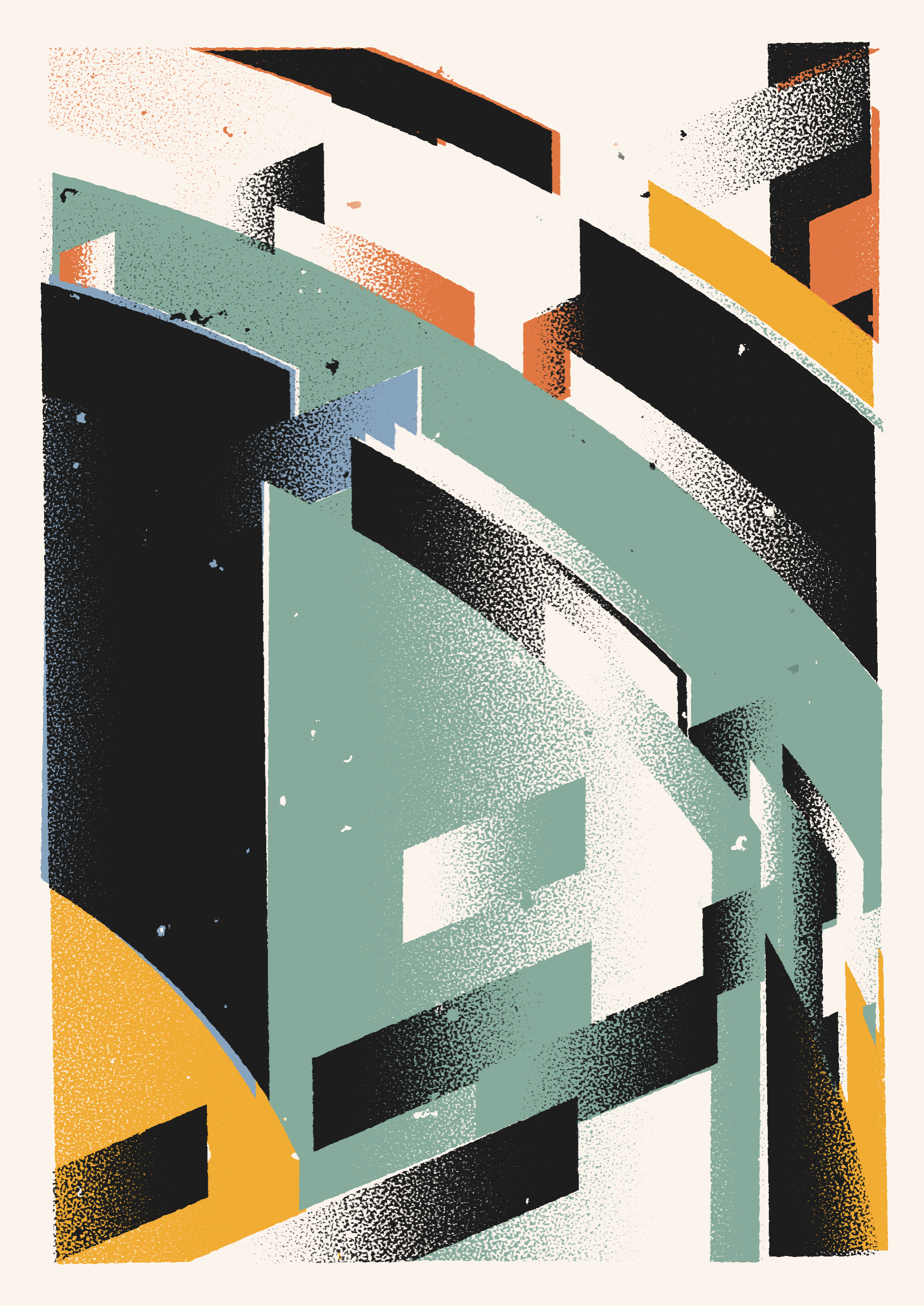 The generative system underlying the rendering mimics the screen printing process by rendering and applying a single color at a time to a master image. Each virtual screen may be more or less aligned with the master, creating a lovely flawed balance to the precision of the rendered geometry.