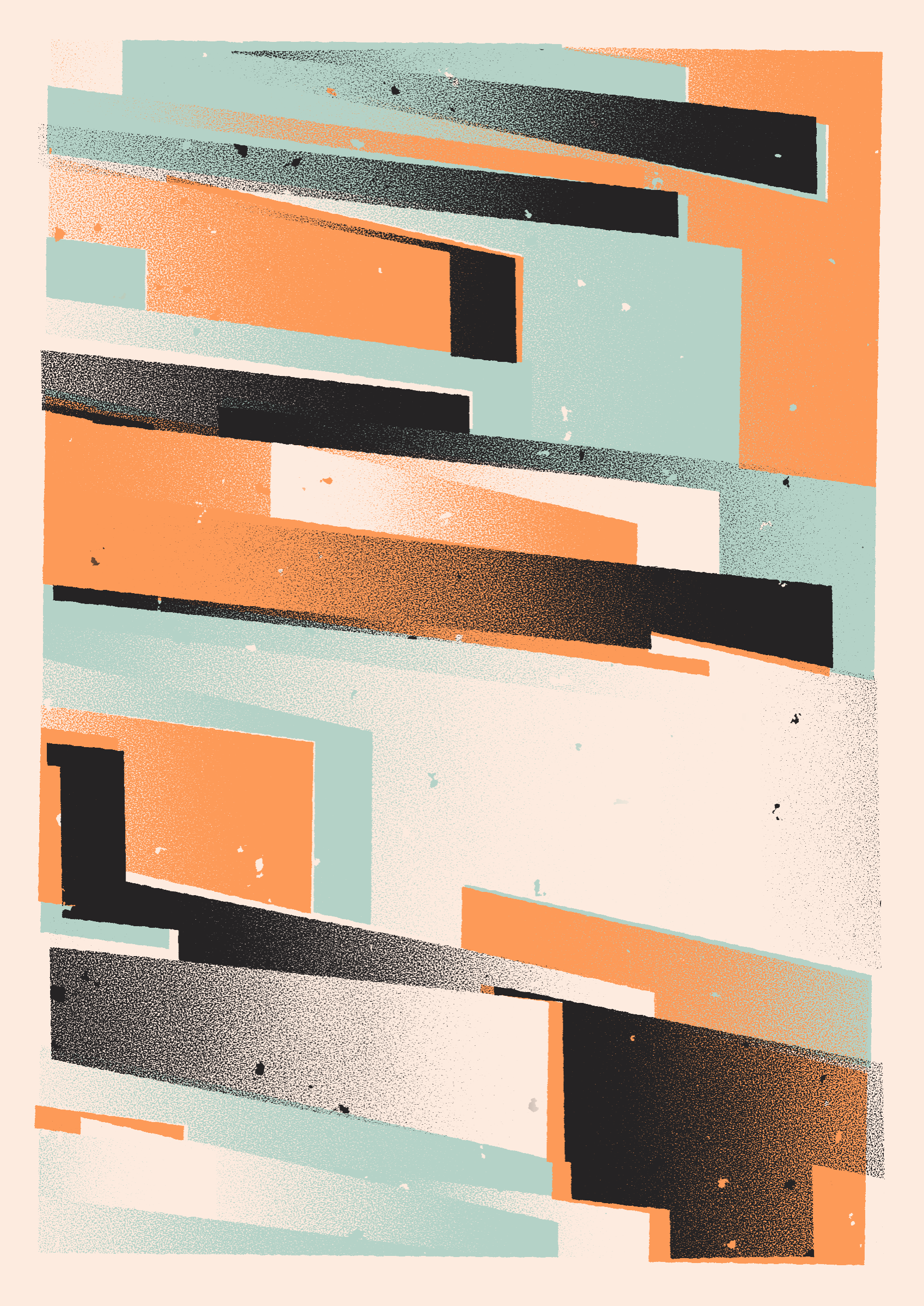 The generative system underlying the rendering mimics the screen printing process by rendering and applying a single color at a time to a master image. Each virtual screen may be more or less aligned with the master, creating a lovely flawed balance to the precision of the rendered geometry.
