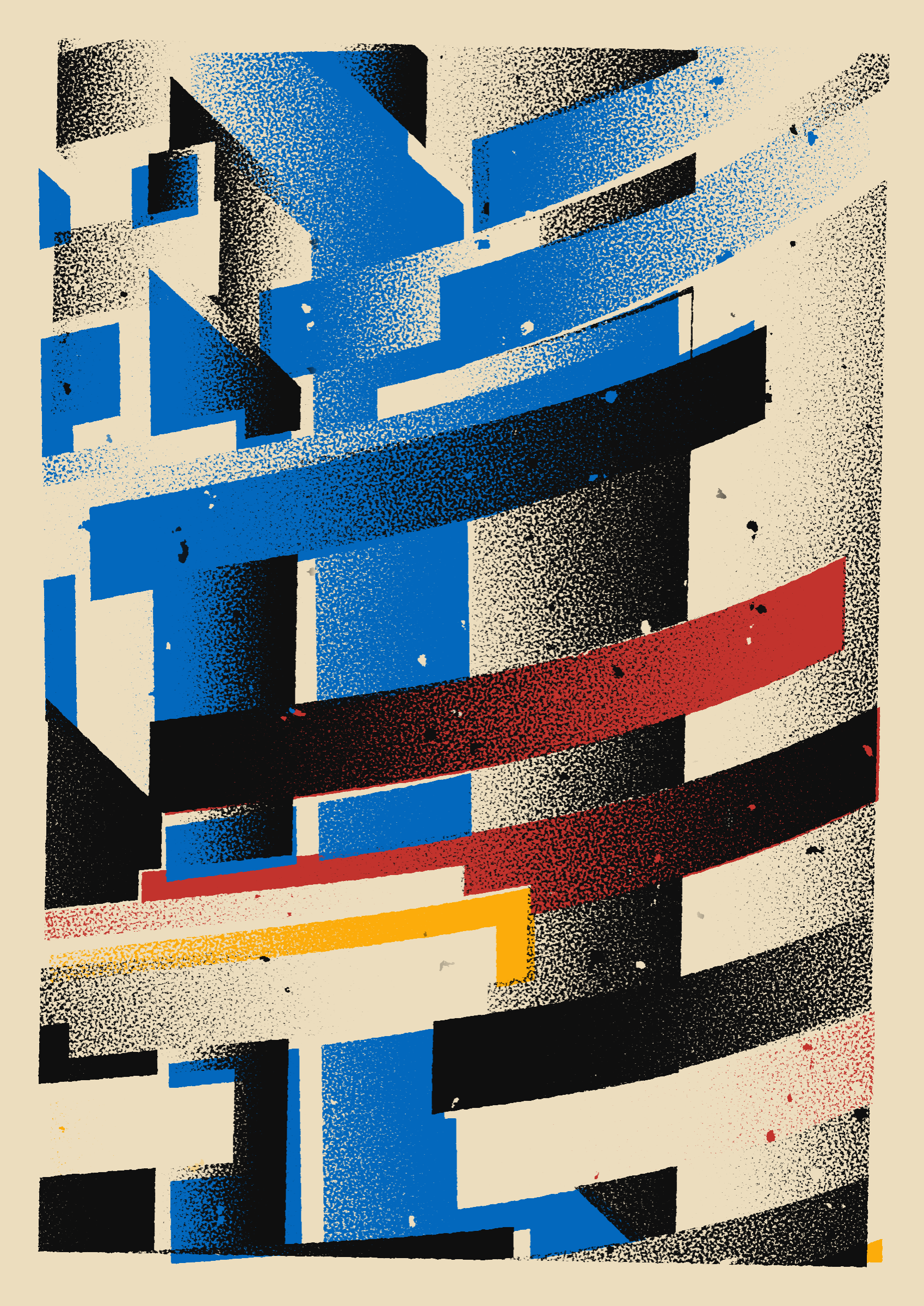 The generative system underlying the rendering mimics the screen printing process by rendering and applying a single color at a time to a master image. Each virtual screen may be more or less aligned with the master, creating a lovely flawed balance to the precision of the rendered geometry.