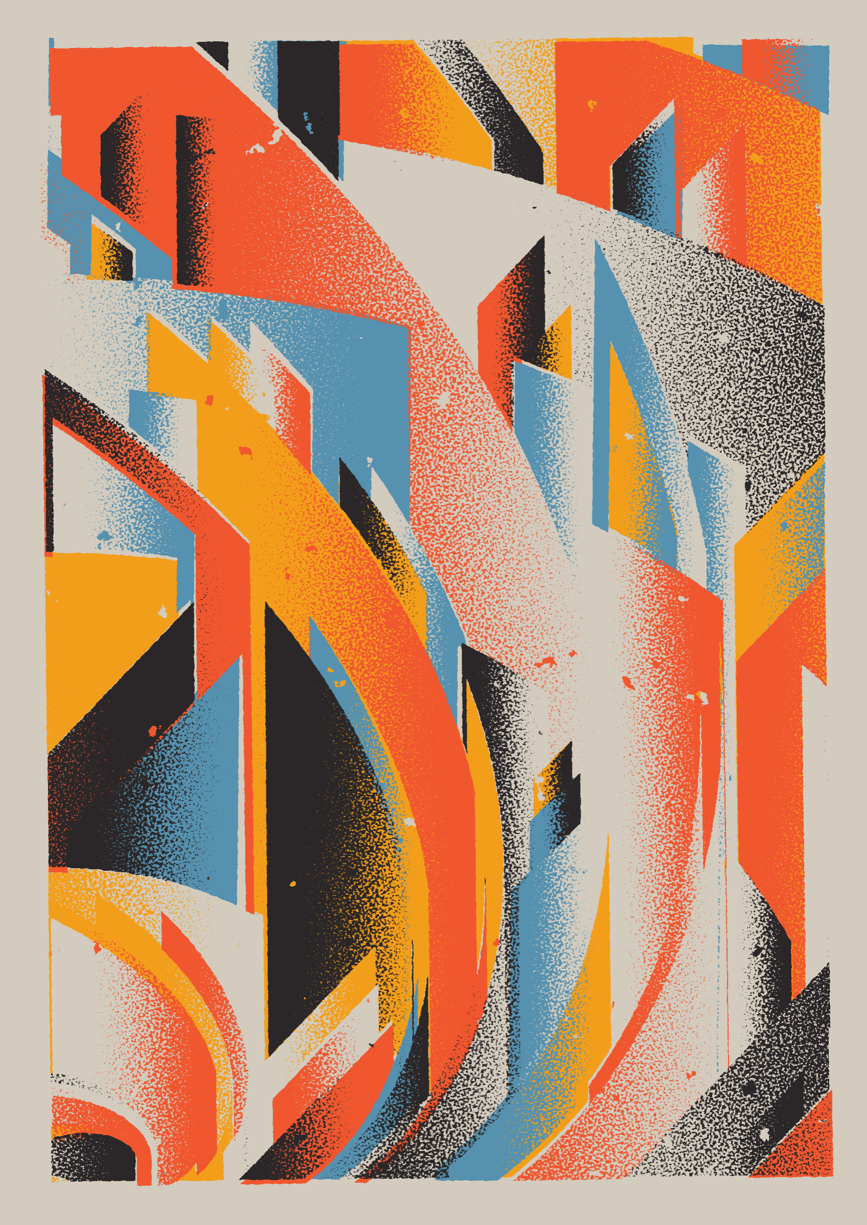The generative system underlying the rendering mimics the screen printing process by rendering and applying a single color at a time to a master image. Each virtual screen may be more or less aligned with the master, creating a lovely flawed balance to the precision of the rendered geometry.