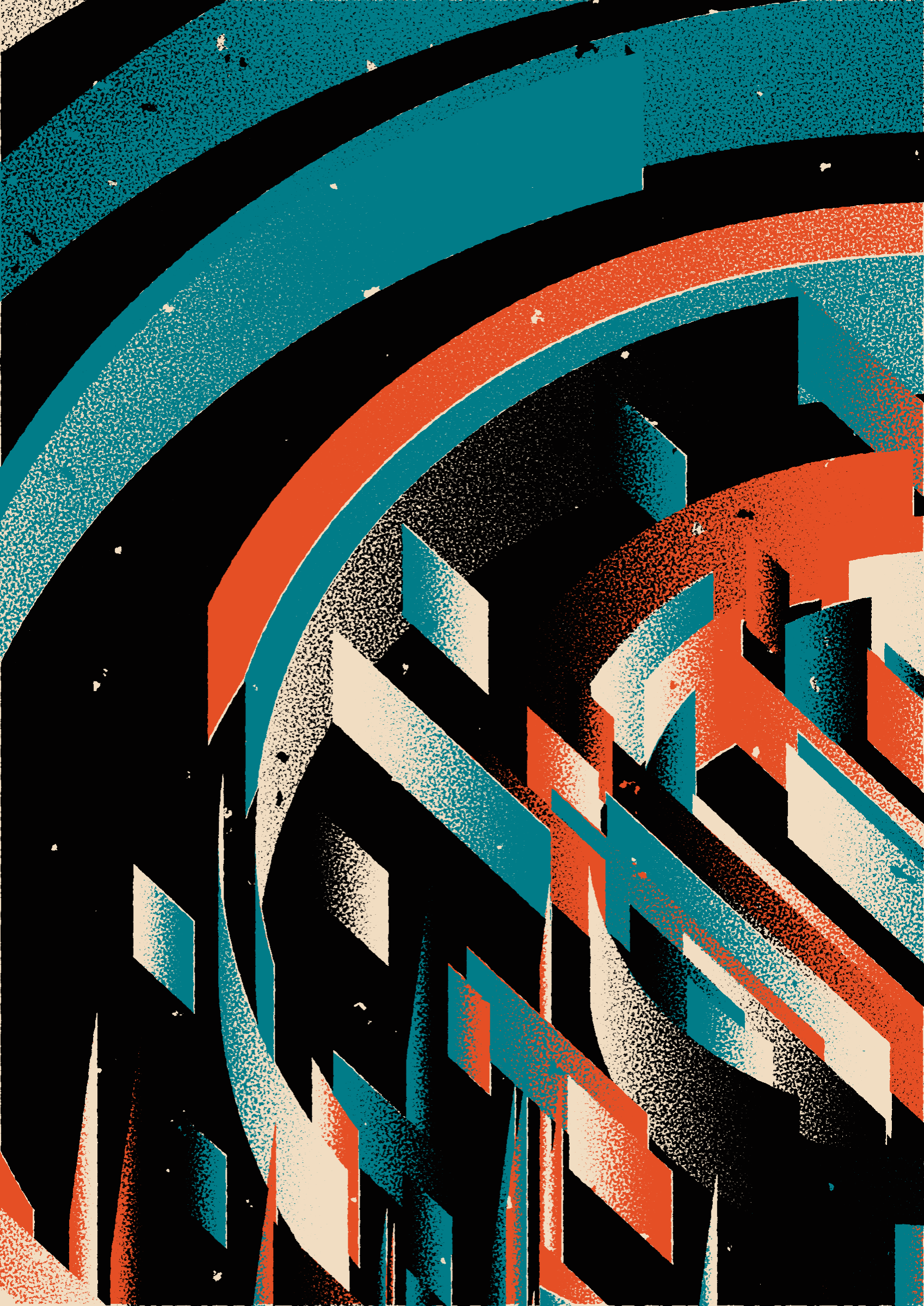 The generative system underlying the rendering mimics the screen printing process by rendering and applying a single color at a time to a master image. Each virtual screen may be more or less aligned with the master, creating a lovely flawed balance to the precision of the rendered geometry.