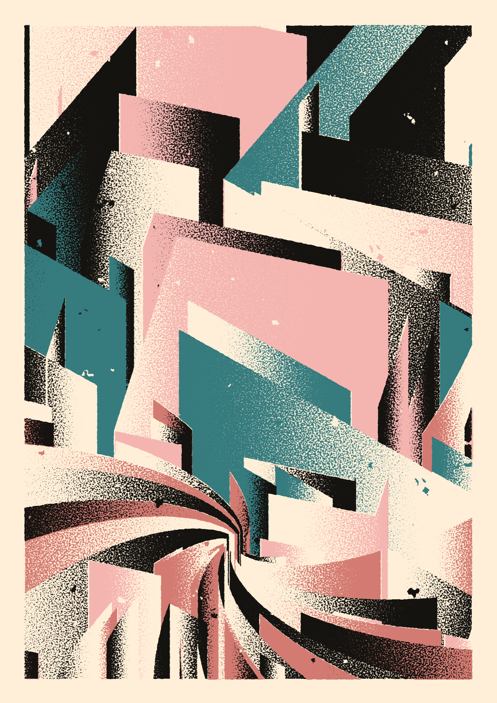 The generative system underlying the rendering mimics the screen printing process by rendering and applying a single color at a time to a master image. Each virtual screen may be more or less aligned with the master, creating a lovely flawed balance to the precision of the rendered geometry.