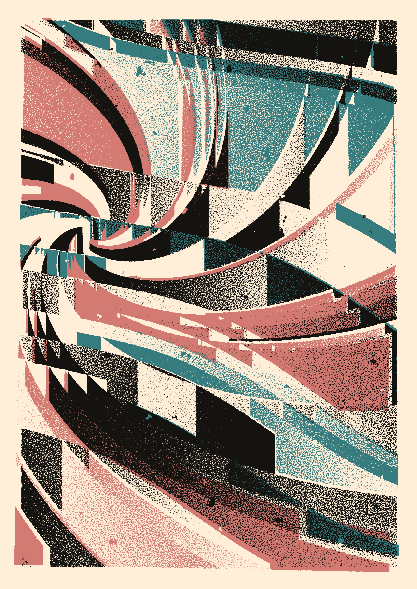 The generative system underlying the rendering mimics the screen printing process by rendering and applying a single color at a time to a master image. Each virtual screen may be more or less aligned with the master, creating a lovely flawed balance to the precision of the rendered geometry.