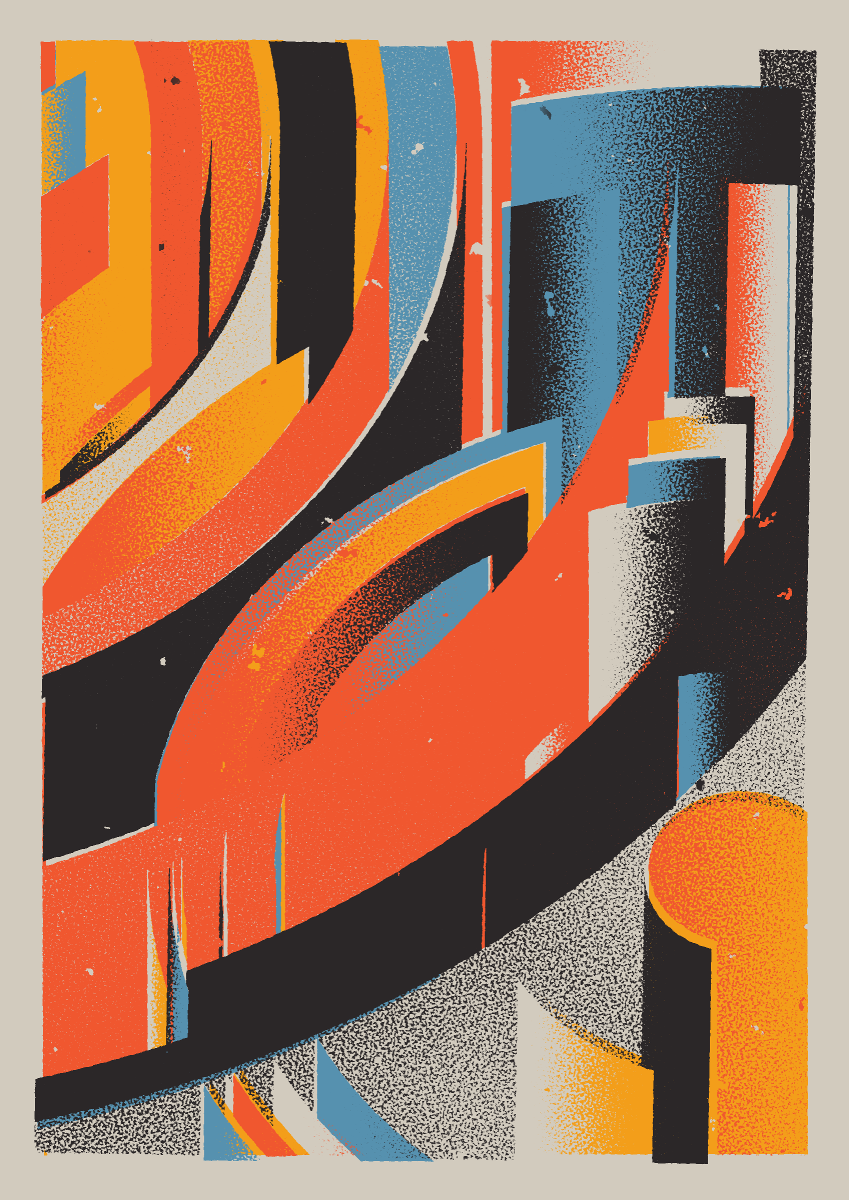The generative system underlying the rendering mimics the screen printing process by rendering and applying a single color at a time to a master image. Each virtual screen may be more or less aligned with the master, creating a lovely flawed balance to the precision of the rendered geometry.