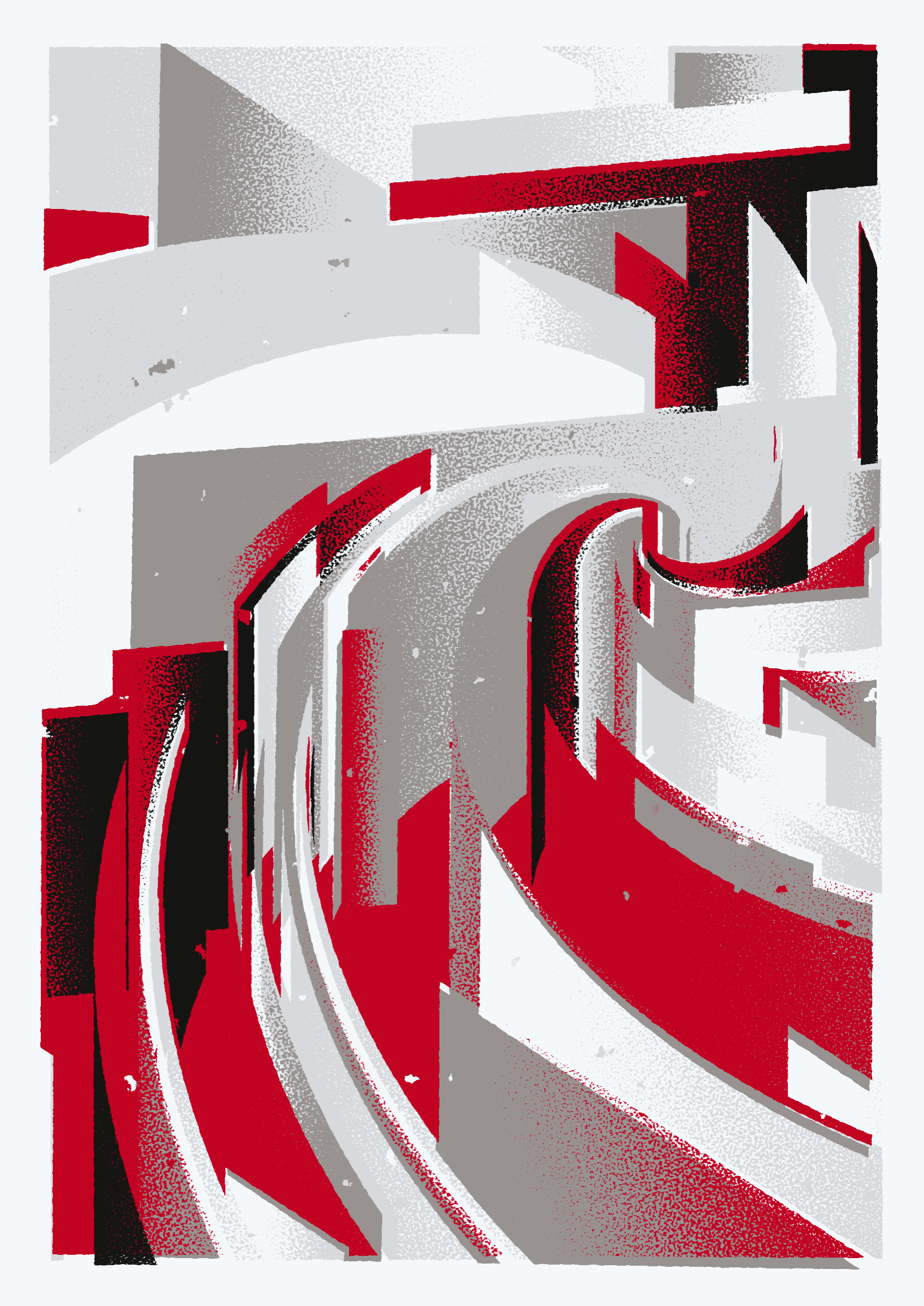 The generative system underlying the rendering mimics the screen printing process by rendering and applying a single color at a time to a master image. Each virtual screen may be more or less aligned with the master, creating a lovely flawed balance to the precision of the rendered geometry.