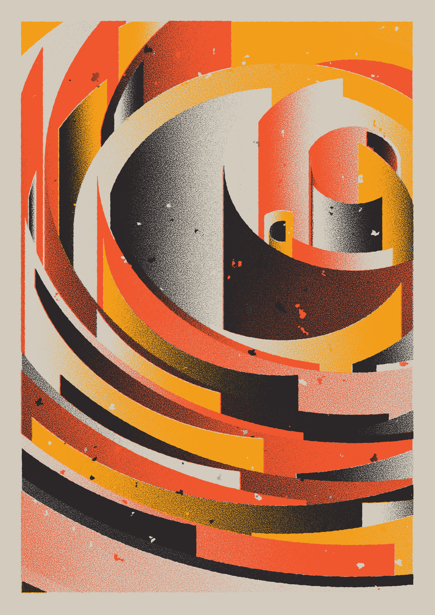 The generative system underlying the rendering mimics the screen printing process by rendering and applying a single color at a time to a master image. Each virtual screen may be more or less aligned with the master, creating a lovely flawed balance to the precision of the rendered geometry.
