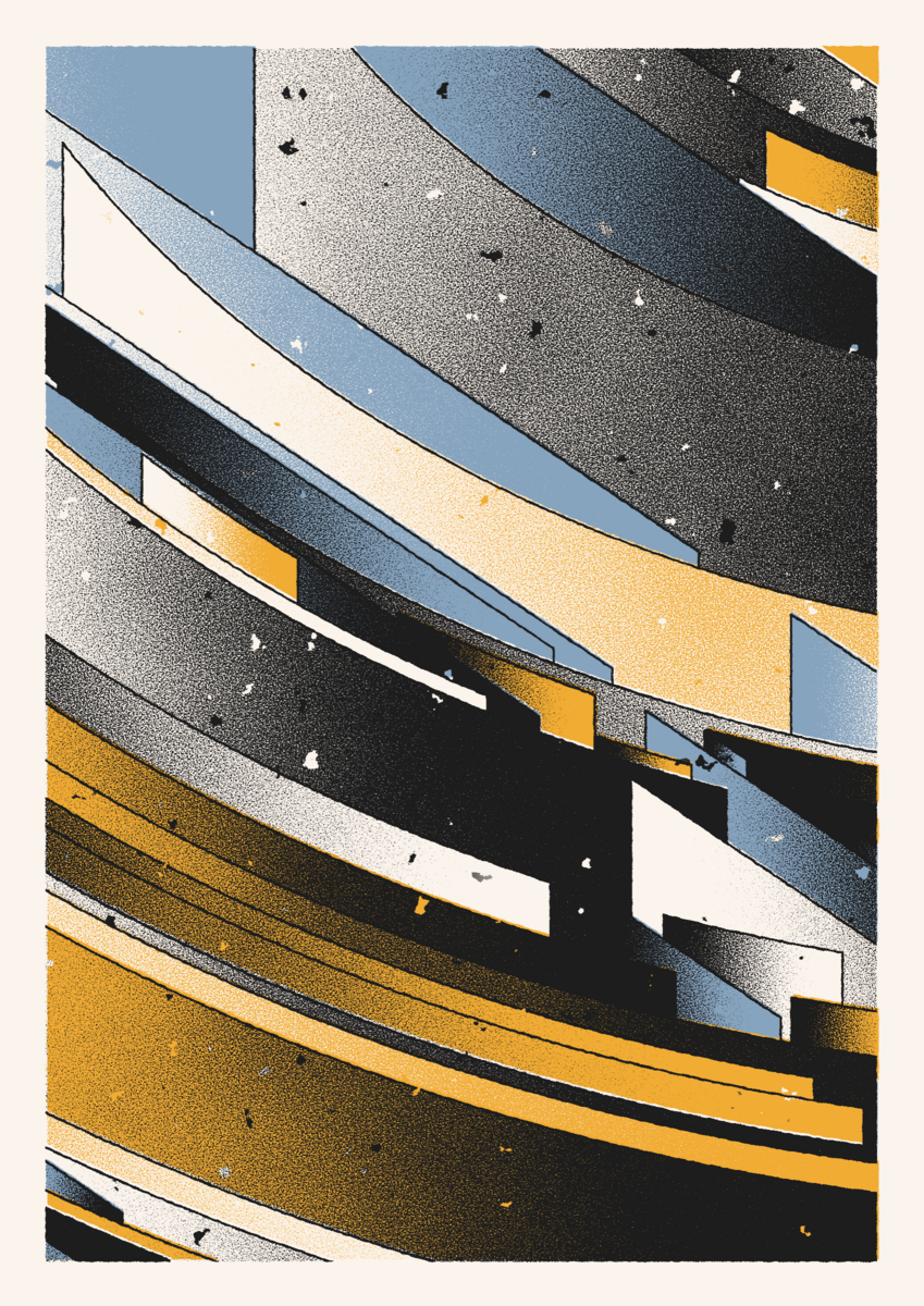 The generative system underlying the rendering mimics the screen printing process by rendering and applying a single color at a time to a master image. Each virtual screen may be more or less aligned with the master, creating a lovely flawed balance to the precision of the rendered geometry.