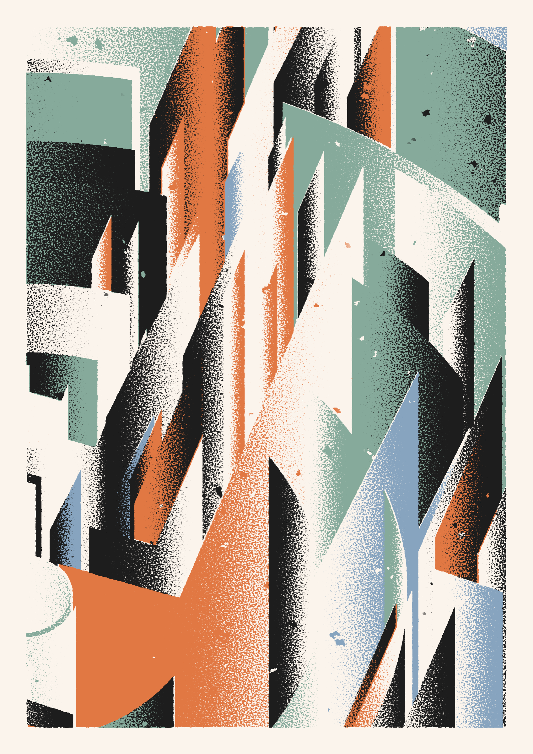 The generative system underlying the rendering mimics the screen printing process by rendering and applying a single color at a time to a master image. Each virtual screen may be more or less aligned with the master, creating a lovely flawed balance to the precision of the rendered geometry.