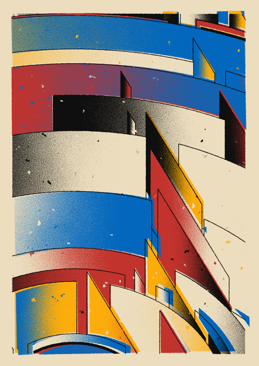 The generative system underlying the rendering mimics the screen printing process by rendering and applying a single color at a time to a master image. Each virtual screen may be more or less aligned with the master, creating a lovely flawed balance to the precision of the rendered geometry.