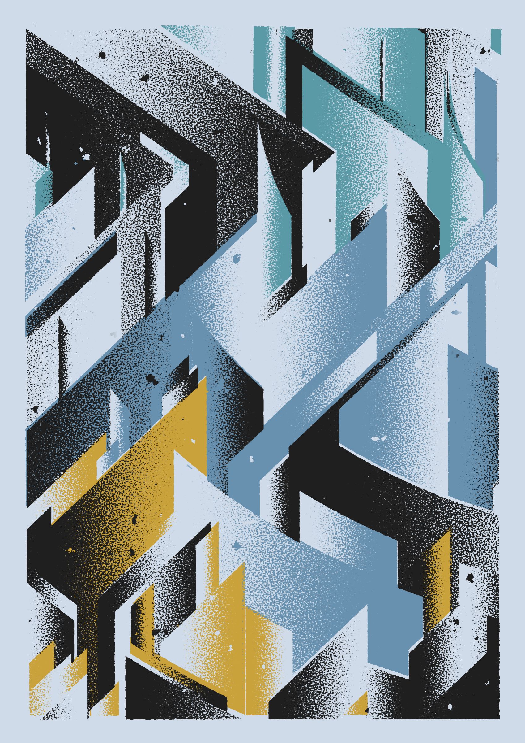 The generative system underlying the rendering mimics the screen printing process by rendering and applying a single color at a time to a master image. Each virtual screen may be more or less aligned with the master, creating a lovely flawed balance to the precision of the rendered geometry.