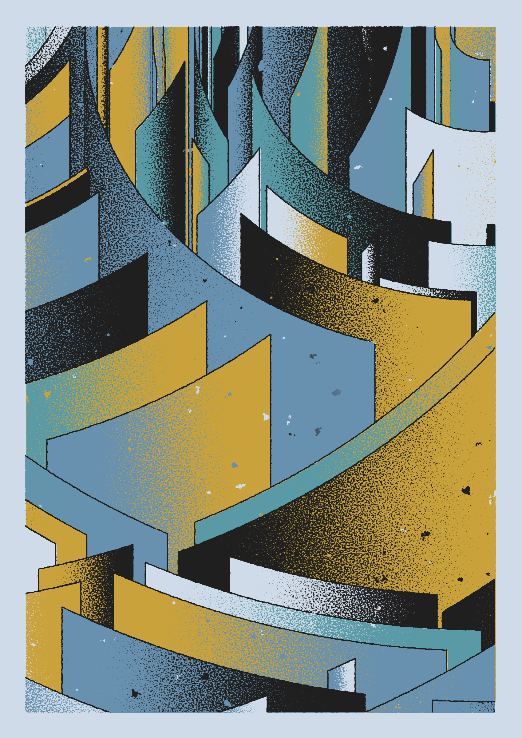 The generative system underlying the rendering mimics the screen printing process by rendering and applying a single color at a time to a master image. Each virtual screen may be more or less aligned with the master, creating a lovely flawed balance to the precision of the rendered geometry.
