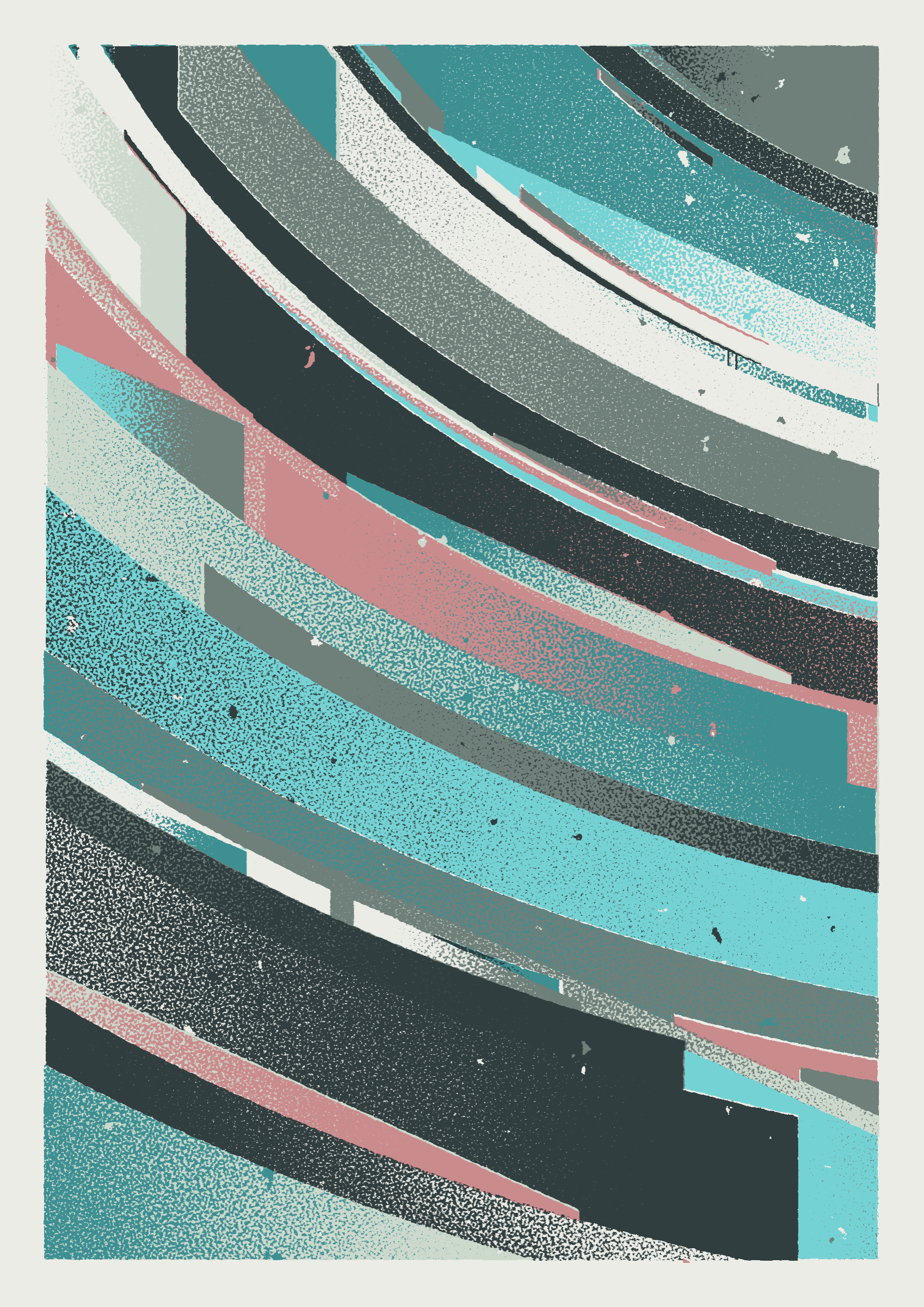The generative system underlying the rendering mimics the screen printing process by rendering and applying a single color at a time to a master image. Each virtual screen may be more or less aligned with the master, creating a lovely flawed balance to the precision of the rendered geometry.