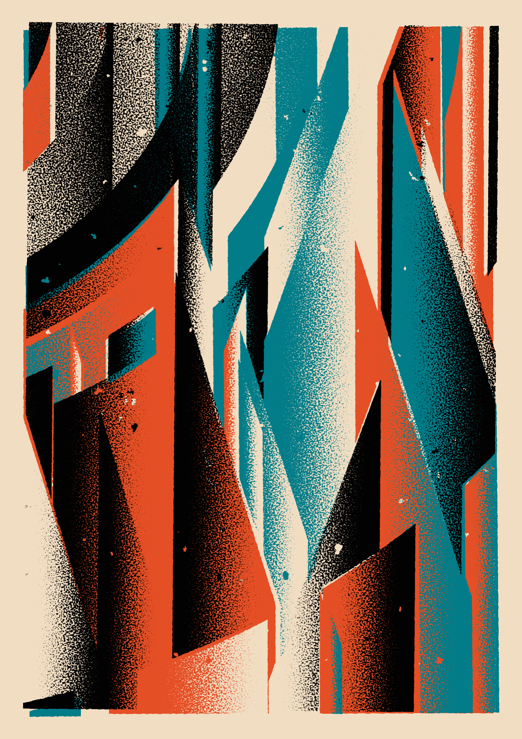 The generative system underlying the rendering mimics the screen printing process by rendering and applying a single color at a time to a master image. Each virtual screen may be more or less aligned with the master, creating a lovely flawed balance to the precision of the rendered geometry.