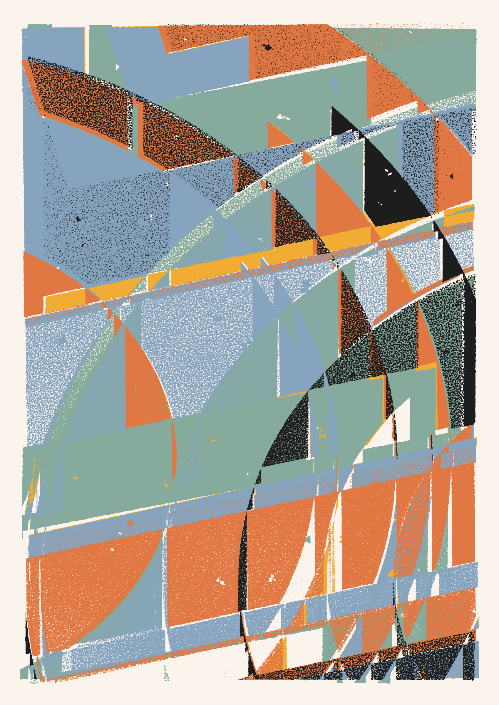 The generative system underlying the rendering mimics the screen printing process by rendering and applying a single color at a time to a master image. Each virtual screen may be more or less aligned with the master, creating a lovely flawed balance to the precision of the rendered geometry.