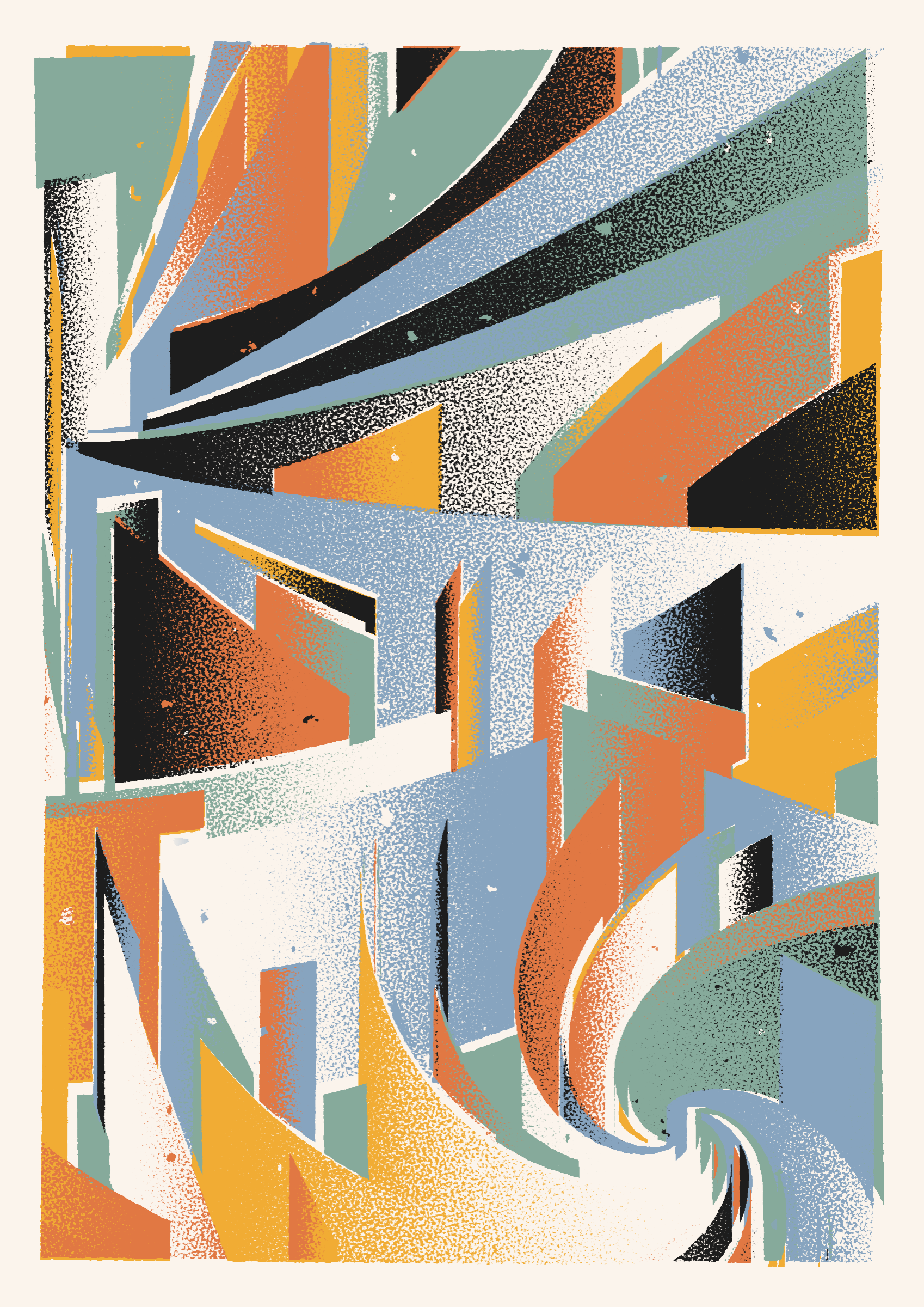 The generative system underlying the rendering mimics the screen printing process by rendering and applying a single color at a time to a master image. Each virtual screen may be more or less aligned with the master, creating a lovely flawed balance to the precision of the rendered geometry.