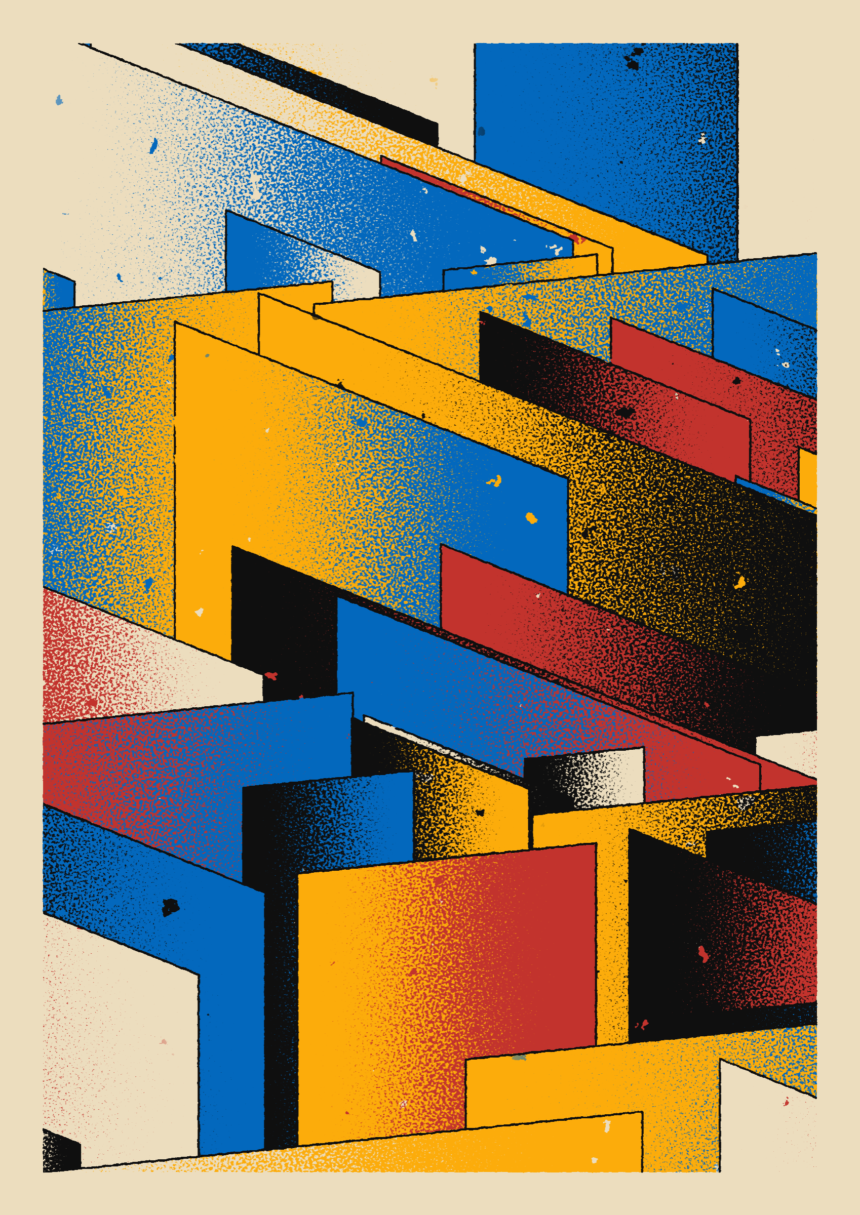 The generative system underlying the rendering mimics the screen printing process by rendering and applying a single color at a time to a master image. Each virtual screen may be more or less aligned with the master, creating a lovely flawed balance to the precision of the rendered geometry.