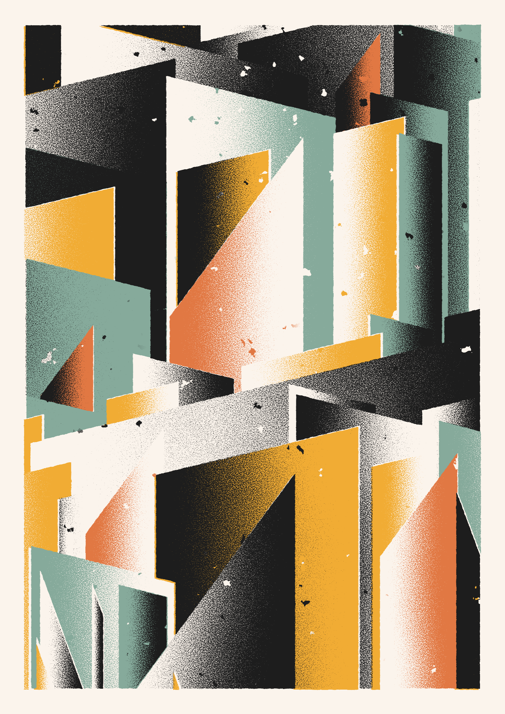 The generative system underlying the rendering mimics the screen printing process by rendering and applying a single color at a time to a master image. Each virtual screen may be more or less aligned with the master, creating a lovely flawed balance to the precision of the rendered geometry.