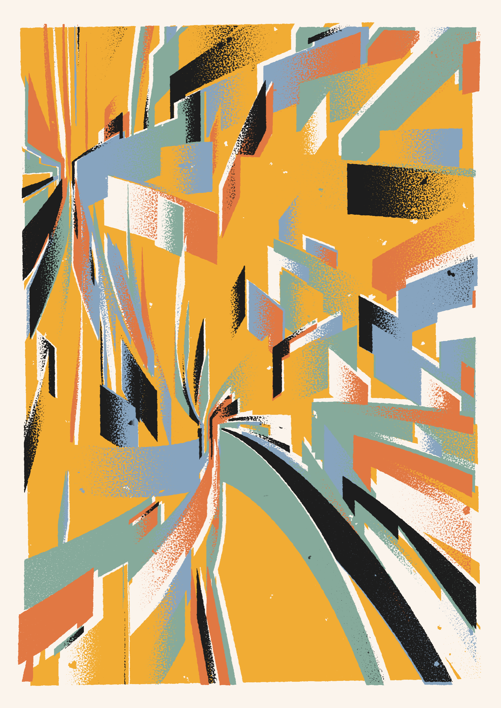 The "Screens" series is a celebration of modern art. It is inspired by the aesthetics inherent in screen printing along with the compositions and colors of both Bauhaus, Constructivism, and pulp fiction sci-fi covers.
