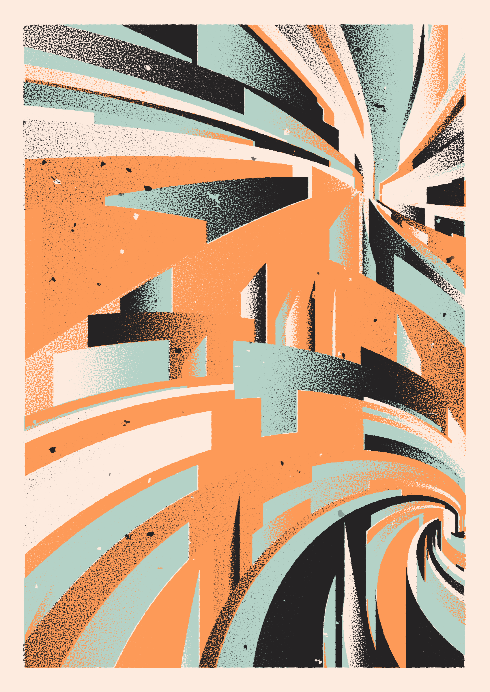 The generative system underlying the rendering mimics the screen printing process by rendering and applying a single color at a time to a master image. Each virtual screen may be more or less aligned with the master, creating a lovely flawed balance to the precision of the rendered geometry.