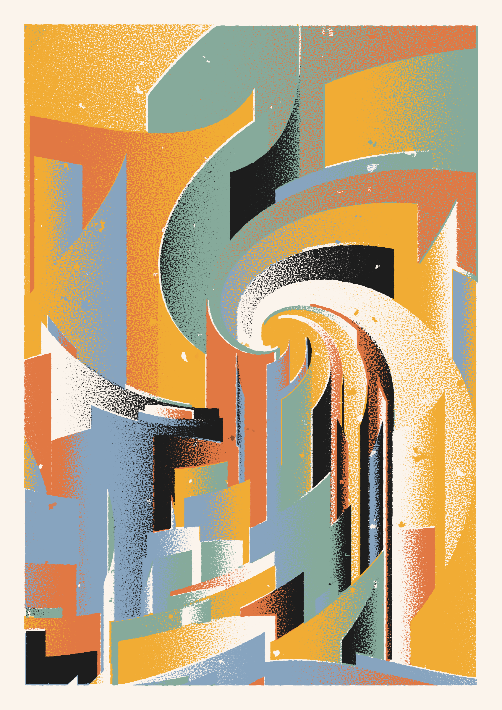 The generative system underlying the rendering mimics the screen printing process by rendering and applying a single color at a time to a master image. Each virtual screen may be more or less aligned with the master, creating a lovely flawed balance to the precision of the rendered geometry.