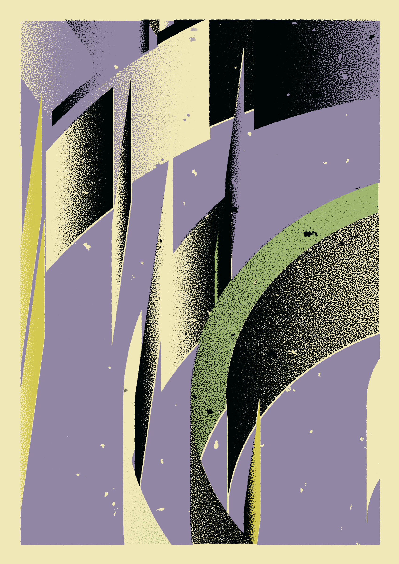 The generative system underlying the rendering mimics the screen printing process by rendering and applying a single color at a time to a master image. Each virtual screen may be more or less aligned with the master, creating a lovely flawed balance to the precision of the rendered geometry.