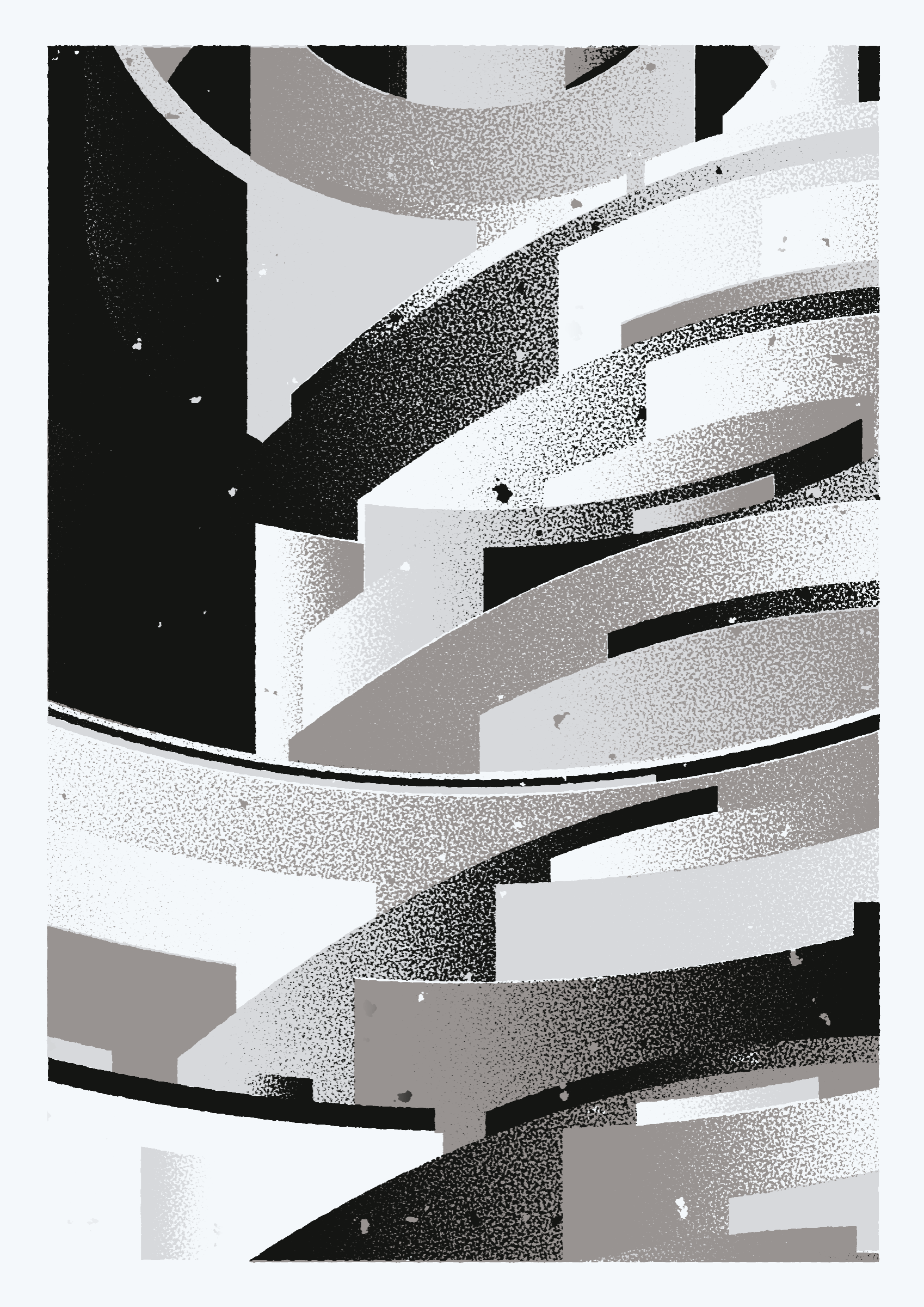 The generative system underlying the rendering mimics the screen printing process by rendering and applying a single color at a time to a master image. Each virtual screen may be more or less aligned with the master, creating a lovely flawed balance to the precision of the rendered geometry.