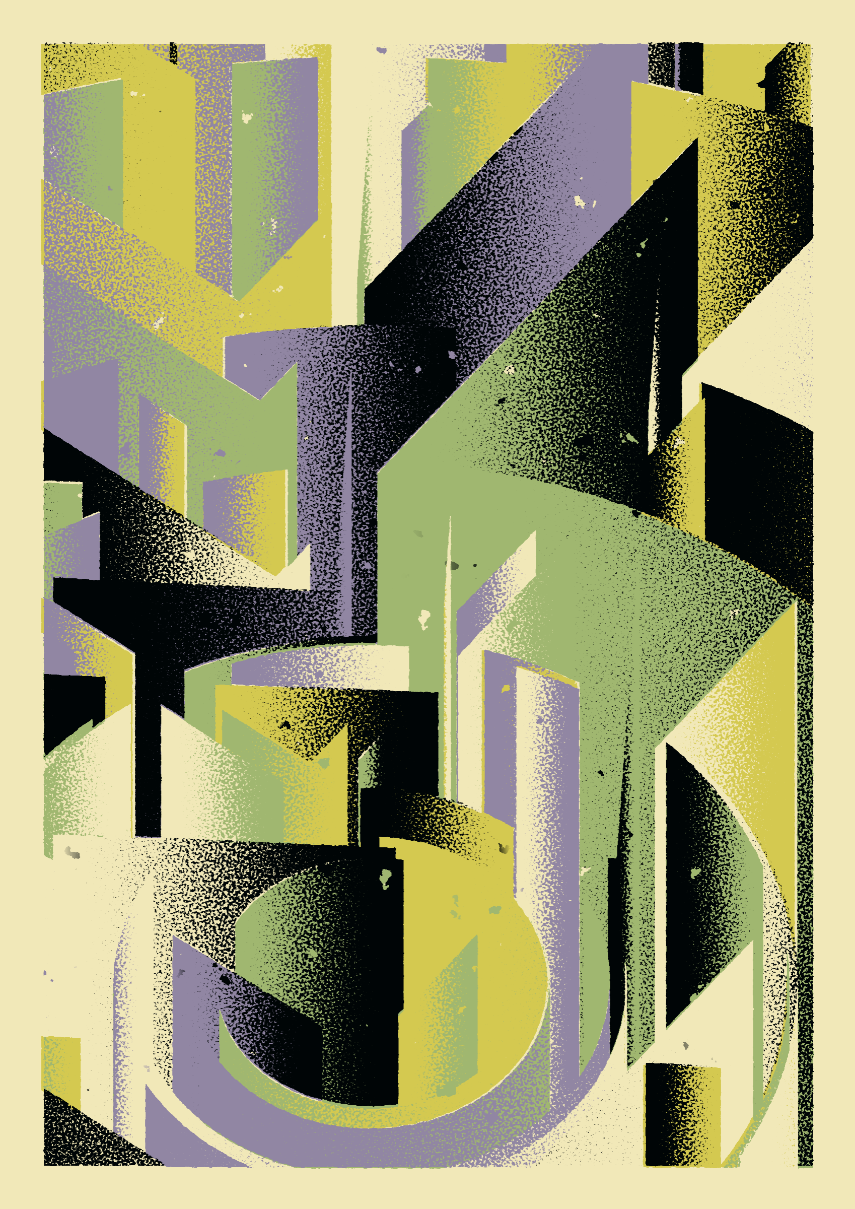 The generative system underlying the rendering mimics the screen printing process by rendering and applying a single color at a time to a master image. Each virtual screen may be more or less aligned with the master, creating a lovely flawed balance to the precision of the rendered geometry.