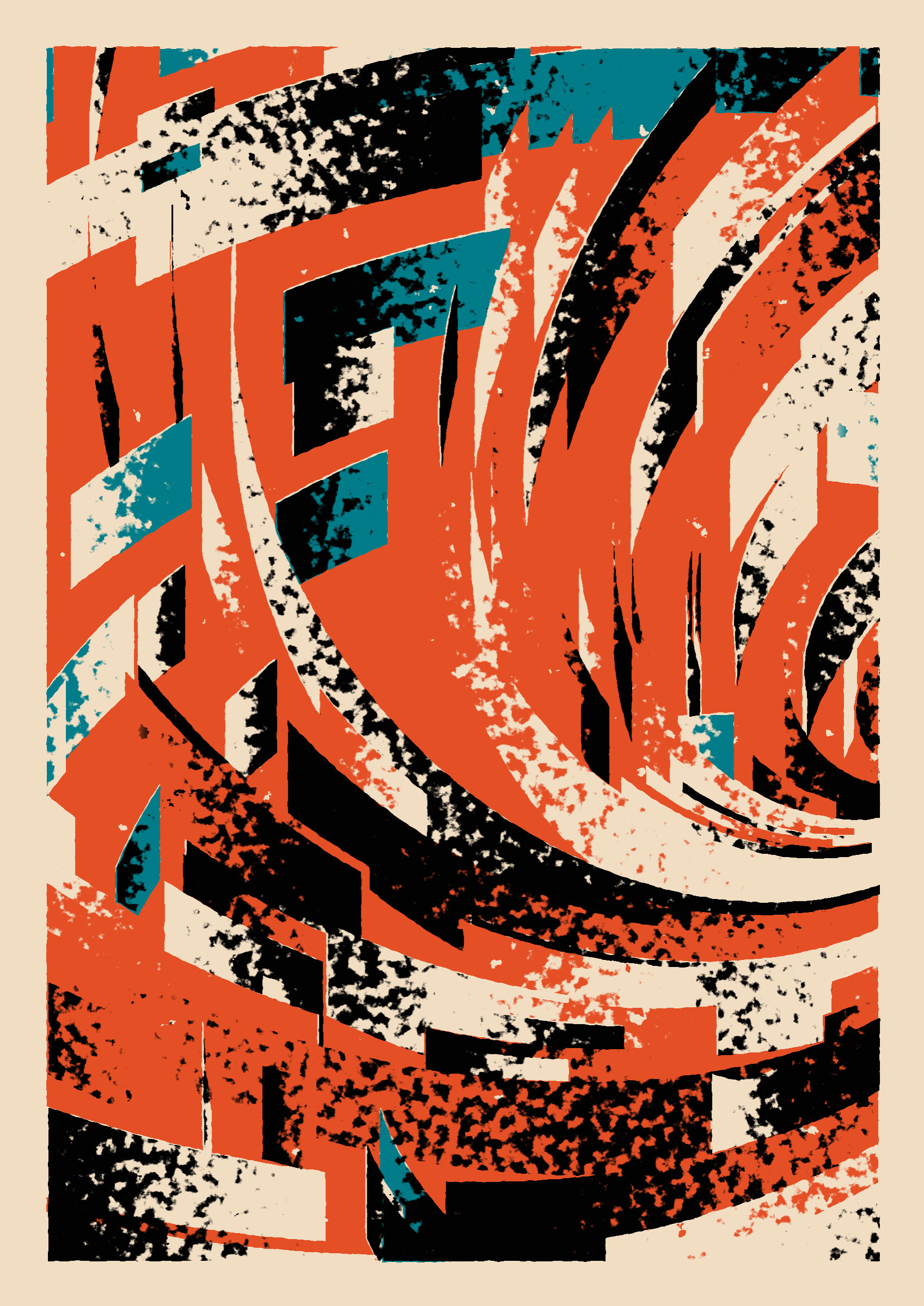 The generative system underlying the rendering mimics the screen printing process by rendering and applying a single color at a time to a master image. Each virtual screen may be more or less aligned with the master, creating a lovely flawed balance to the precision of the rendered geometry.