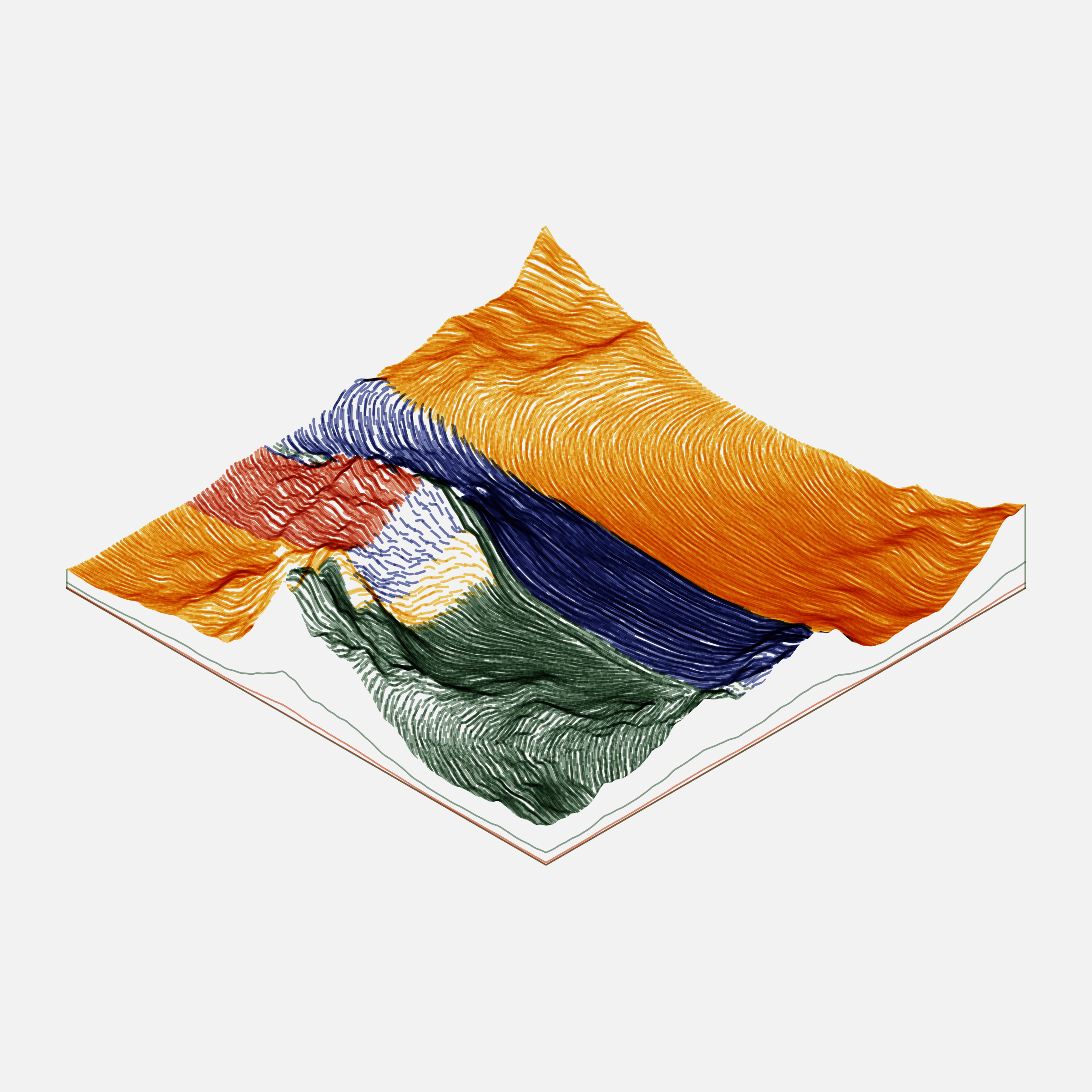 A generative algorithm that draws the impression of a landscape from a multitude of possibilities. The unique seed from each token drives the parametric assortment of lines, colors, and forms into a constructed composition.