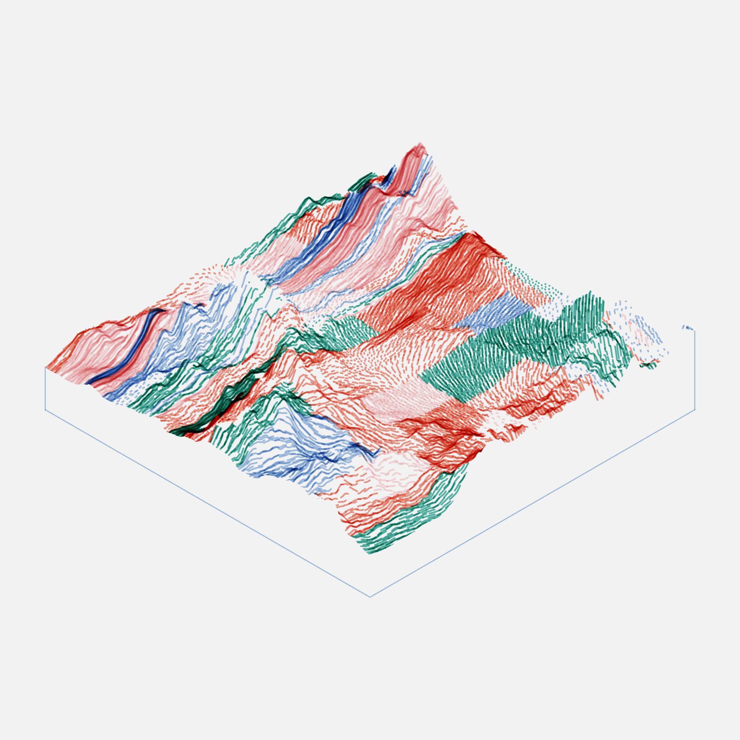 A generative algorithm that draws the impression of a landscape from a multitude of possibilities. The unique seed from each token drives the parametric assortment of lines, colors, and forms into a constructed composition.